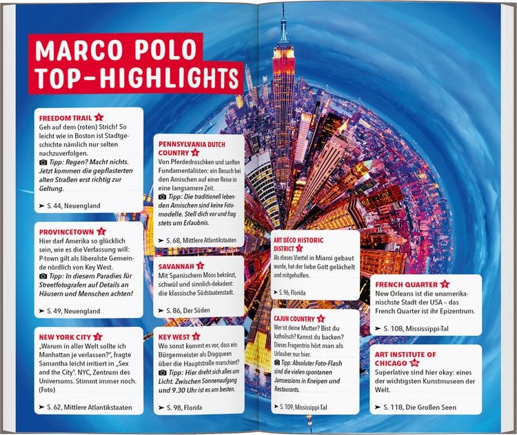 Eine Reise zur Wiege Amerikas: Der MARCO POLO Reiseführer USA Ost Ein einziger Urlaub reicht kaum aus, um die amerikanische Ostküste kennenzulernen. In Neuengland kommt Europa-Feeling auf, die Südstaaten locken mit wildromantischer Natur und exzellenter Küche. Im Sunshine State Florida sprüht das Nightlife, an der Grenze zu Kanada der berühmteste Wasserfall der Welt. Welches Abenteuer willst du erleben? Mit MARCO POLO kannst du dich jeden Tag neu entscheiden und verpasst kein Highlight der Region! MARCO POLO Insider-Tipps für unvergessliche Momente auch abseits der bekannten Touristenpfade Smarter unterwegs mit den MARCO POLO Erlebnistouren und kostenloser Touren-App (mit Online- und Offlinekarten) Best-of-Tipps für Regentage, Low-Budget-Unternehmungen und Urlaub mit Kindern Viele Extra-Empfehlungen für Shopping, Restaurants und sportliche Aktivitäten Komplett aktualisierte Highlight-Karten und herausnehmbarer Faltplan für einfache Orientierung Alles drin von Neuengland bis Florida: Maximal einfache Reiseplanung mit MARCO POLO Mit MARCO POLO fängt dein Urlaub zu Hause an! Musik-Playlists, Buch- und Filmtipps bringen dich schon vor deinem USA-Trip in Stimmung. Viele Infos zum Land, Wissenswertes für Anreise und Übernachtungen und alle Highlights rund ums Jahr machen die Reisevorbereitung zum Kinderspiel. Vor Ort kannst stellst du dir deine persönlichen Must-sees zusammen. Ob Whale Watching auf Cape Cod oder Sightseeing in Washington – mit deinem MARCO POLO Reiseführer erlebst du den Osten der USA authentisch und individuell!