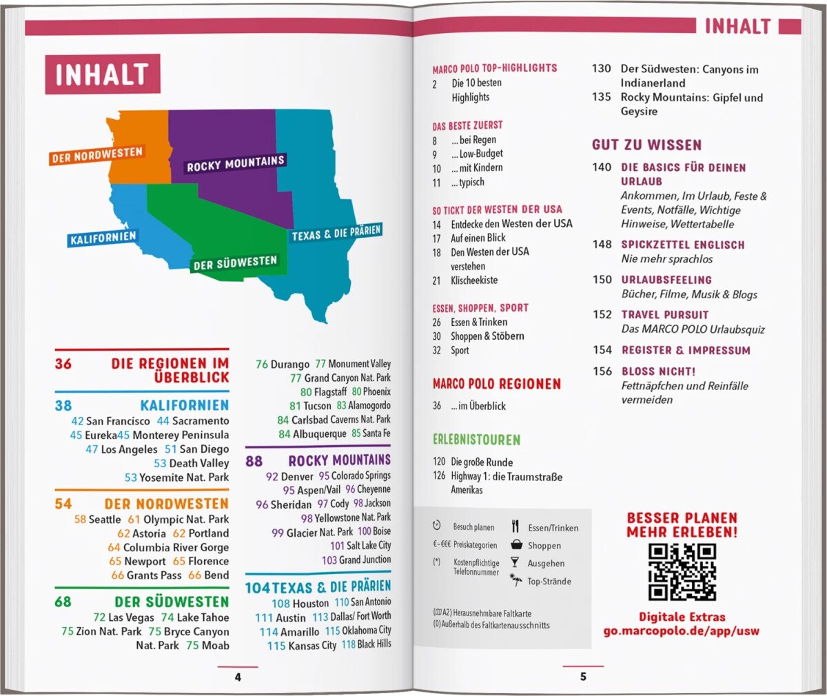 Mit dem MARCO POLO Reiseführer USA West hast du alle Regionen im Überblick: Von Kalifornien, über den Nordwesten mit Seattle und Portland, die Rocky Mountains mit Salt Lake City über den Südwesten mit Las Vegas bis nach Texas. In deinem MARCO POLO Reiseführer findest du alles, was du für deinen Urlaub brauchst: Wissenswertes zum Reiseziel und zur Anreise, Tipps für Übernachtungen, Shopping, Sport und einzigartige Erlebnistouren.
