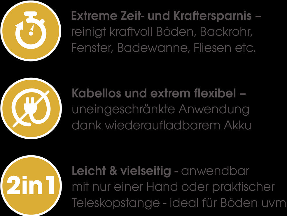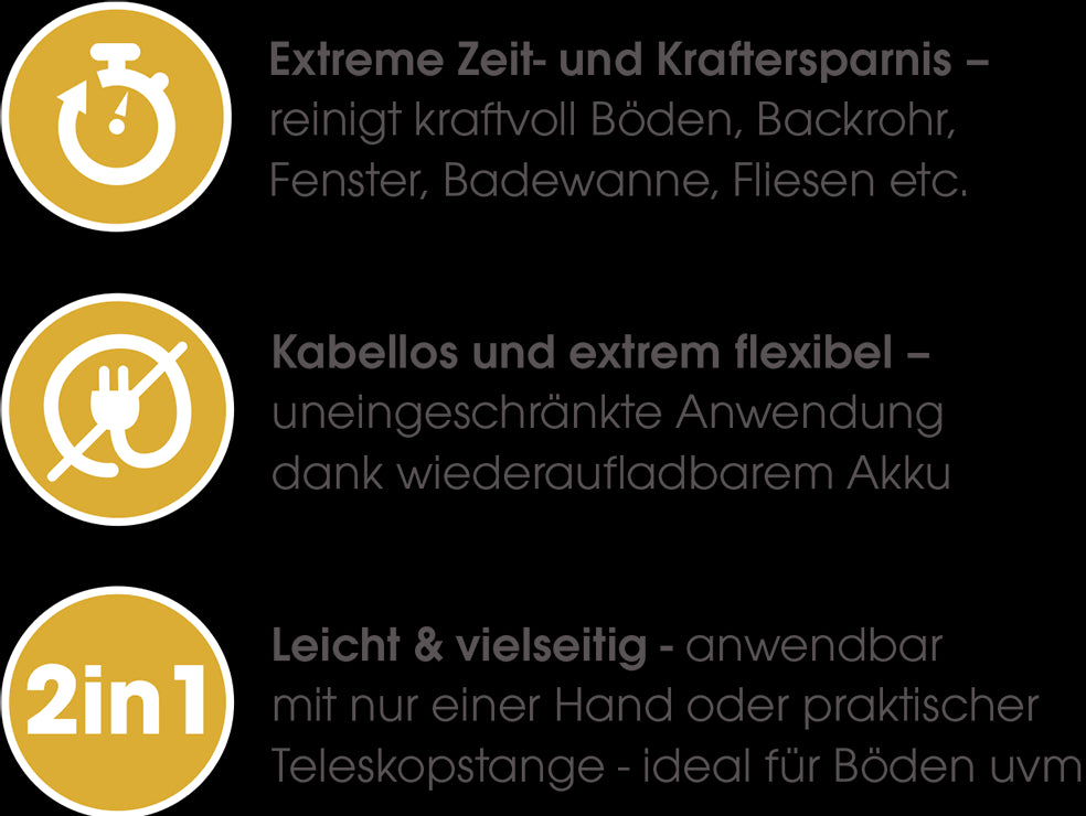 Dank wiederaufladbarem Akku gibt es unzählige Anwendungsbereiche und kein lästiges Kabel ist im Weg. Mit der bis auf 105 cm ausziehbaren Teleskopstange werden auch schwer erreichbare Stellen mühelos gereinigt und der Rücken wird geschont. Dadurch ist die leichte und flexible Putzbürste auch ideal für über-Kopf Arbeiten.