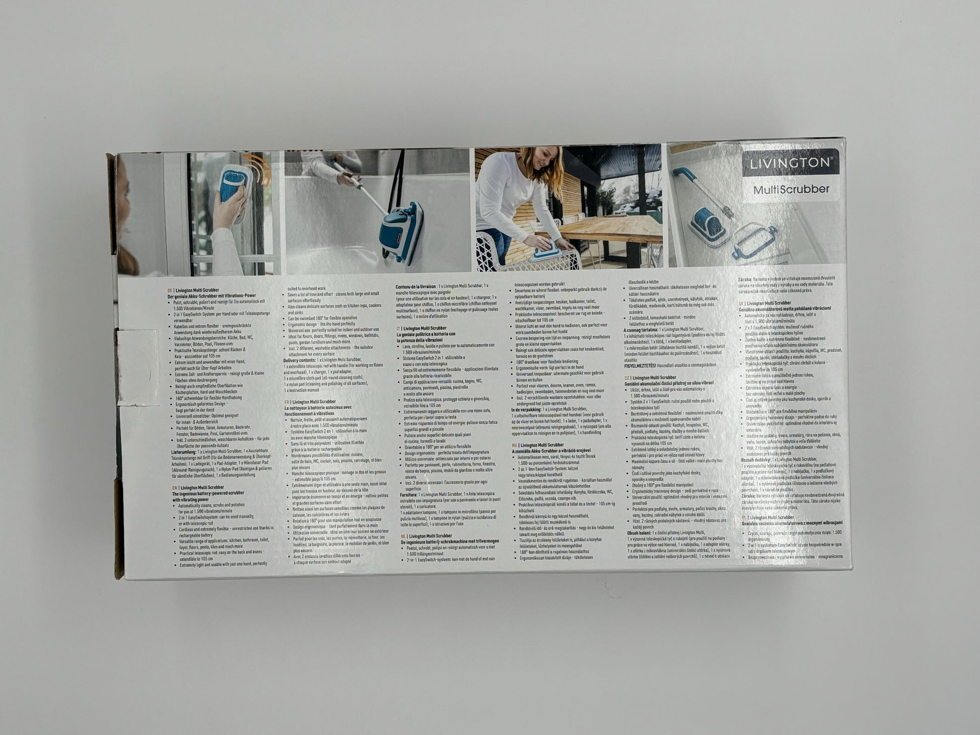 - Lieferumfang: Je 1 x Livington MultiScrubber, Teleskopstange, Adapterpanel, Nylon- und Mikrofaserpad, Ladegerät