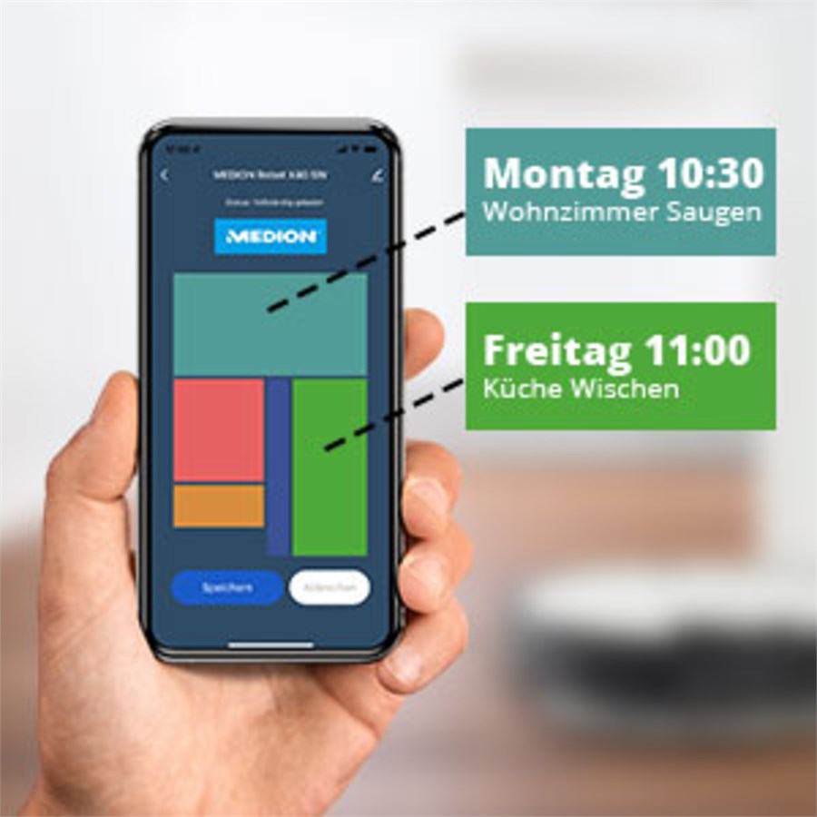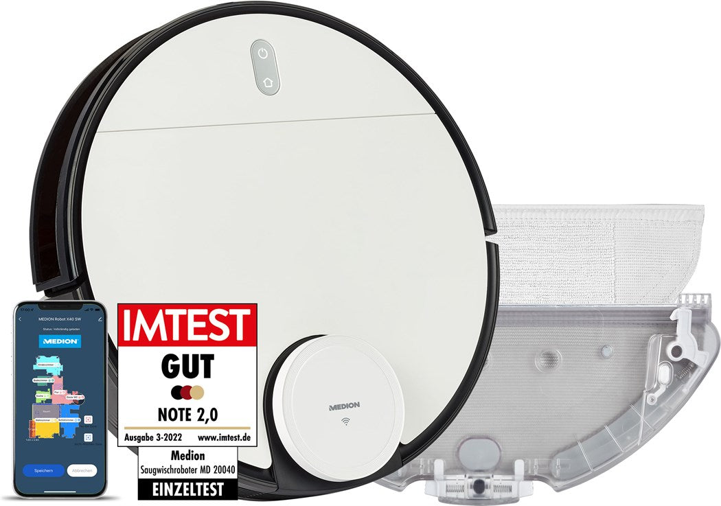 Der MEDION X40 SW ist ein praktischer und intelligenter Saug- und Wischroboter. Durch seine präzise 360°-Lasernavigation ist er immer genau dort zur Stelle wo er gebraucht wird und arbeitet besonders effizient. Er kartiert Deine Wohnung, umfährt Hindernisse zuverlässig und reinigt nach festgelegten Zeitplänen oder manuell per Klick alles steuer- und einsehbar in der praktischen App.