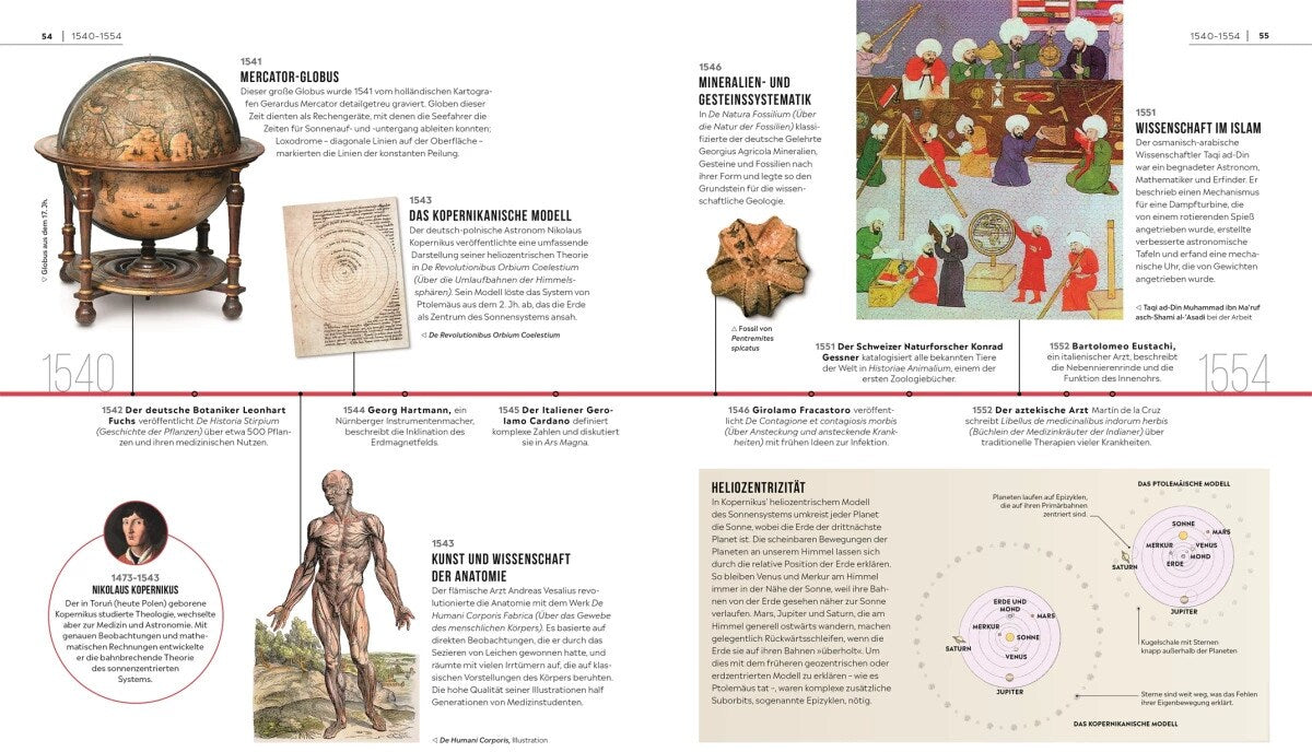 Astronomie, Medizin und Technik. Auf Sonderseiten werden herausragende wissenschaftliche Durchbrüche ausführlich erklärt. Porträts von berühmten Wissenschaftler*innen wie Alexander von Humboldt, Alois Alzheimer oder Marie Curie runden dieses einzigartige Sachbuch ab.