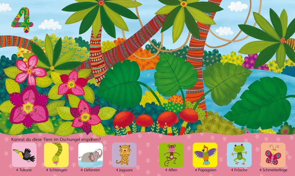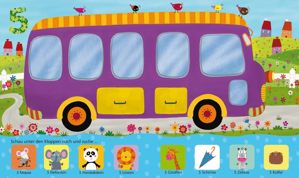 Findest du einen Hund? Siehst du zwei Schmetterlinge? Und wo haben sich die drei Affen versteckt? Unter mehr als 80 Klappen kannst du lustige Tiere und Gegenstände suchen und dabei spielerisch das Zählen, Wiedererkennen und Benennen üben. So macht das Zählen schon den Kleinsten Spass!