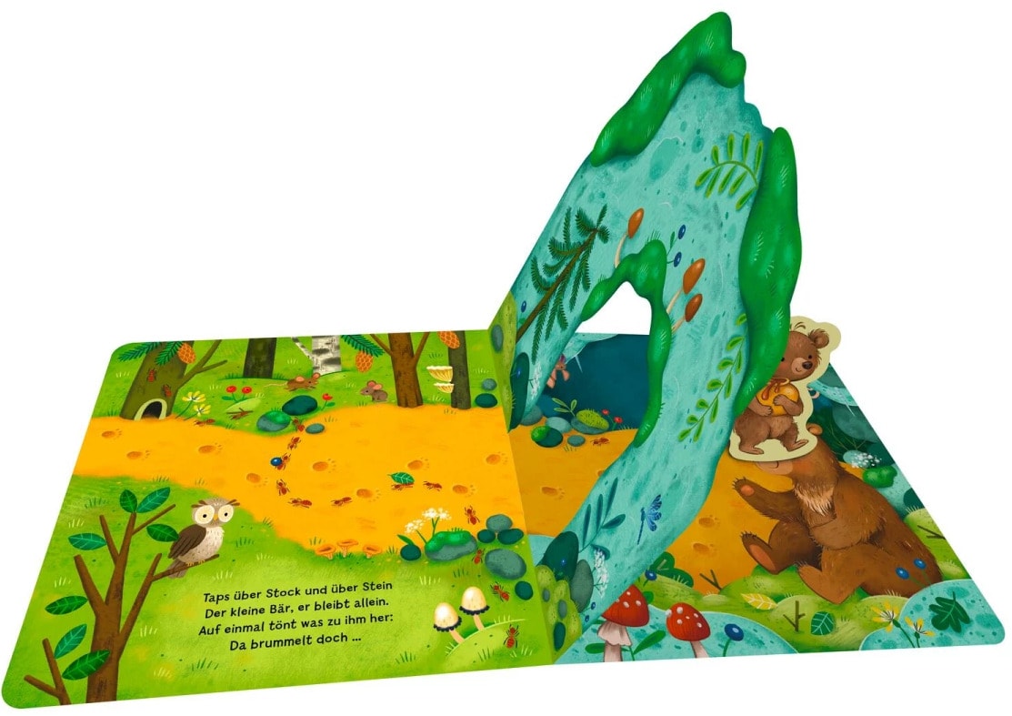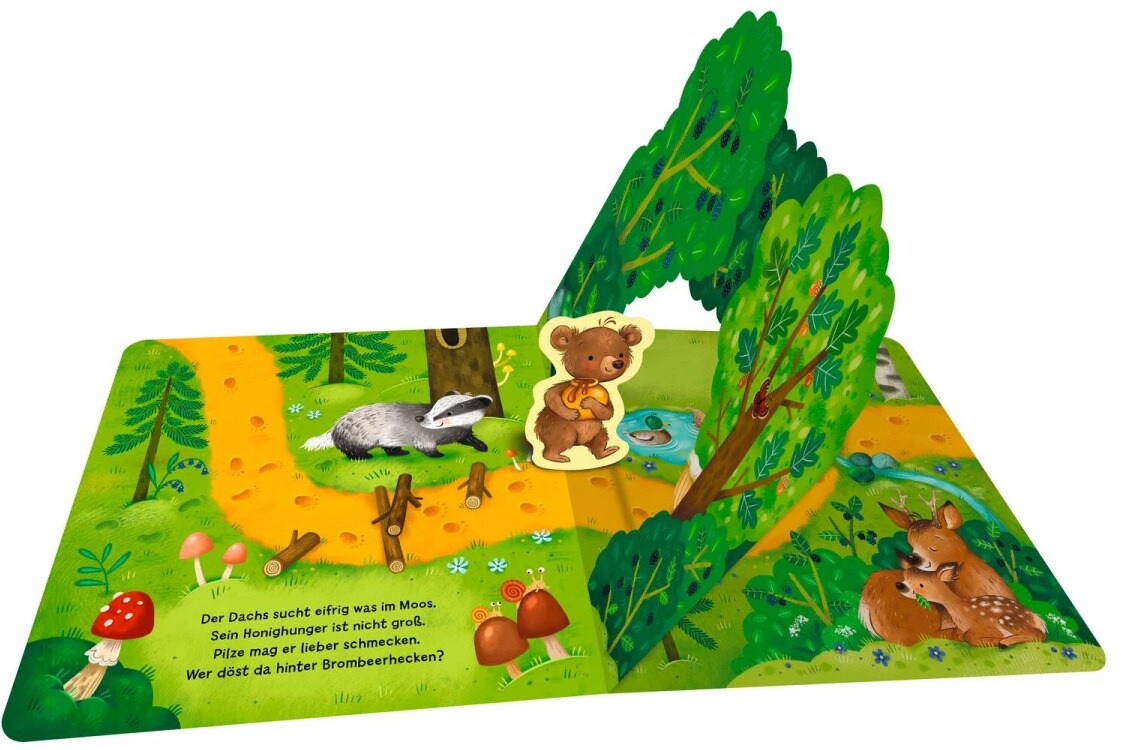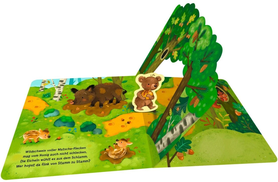 Spielspass für die Kleinsten: Durch den Wald mit dem kleinen BärenDer kleine Bär mag Honig sehr. Wer wohl heute gemeinsam mit ihm nascht? Kinder ab 18 Monaten bewegen die Bären-Figur spielend durch den Wald und begegnen dabei den beliebtesten Tieren. Der Hase knabbert am liebsten grünen Klee, das Eichhörnchen sammelt Nüsse, der Dachs lässt sich Pilze schmecken und das Rehkitz zupft zarte Blätter von den Ästen. Nur einer schleckt Honig auch ganz besonders gerne. Na klar, der grosse Bär!