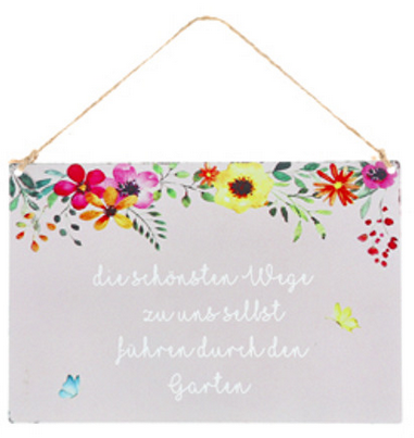 Diese dekorative Schild ist für Gartenliebhaber gemacht. Das Schild ist in zartem rosa gehalten. Mit dem Spruch "Die schönsten Wege zu uns selbst, führen durch den Garten" ist es ein dekoratives Accessoire für Türe, Gartenhaus und Wohnzimmer.