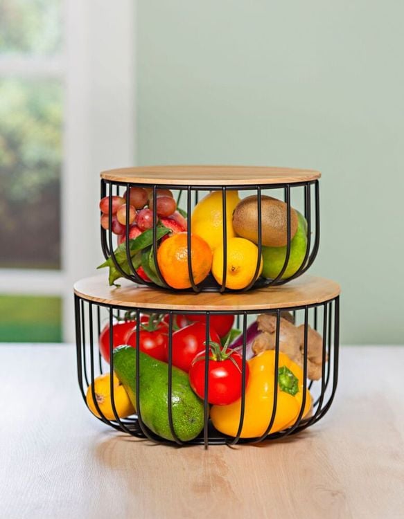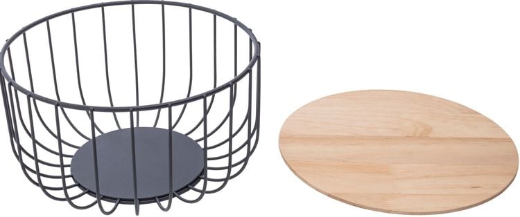 Obstkorb aus schwarzem Metall Elegantes Design Mit Holzdeckel Auch zum Stapeln Schicker Platz für Obst und Gemüse: Metallkorb mit Deckel Dieser Metallkorb verschafft Obst, Gemüse oder auch den Frühstücksbrötchen einen Logenplatz in der Küche oder im Esszimmer. Durch die Metallstreben ist der Inhalt sichtbar und kann so im schönen Kontrast zum Schwarz des Korbes für einen Hingucker sorgen. Passend zum nordisch-schlichten Design ist auch der Holzdeckel. Dieser dient zugleich als Ablagefläche bzw. bietet die Möglichkeit, mehrere Körbe aufeinander zu stapeln. Das spart Platz in der Küche! Metallkorb mit Deckel, groß: Maße: Ø 27,3 cm, Höhe 15 cm aus pulverbeschichtetem, lebensmittelechtem Metall Deckel aus Holz Direkt hier im Shop bestellen: den Metallkorb mit Deckel - und lässiger Eleganz.