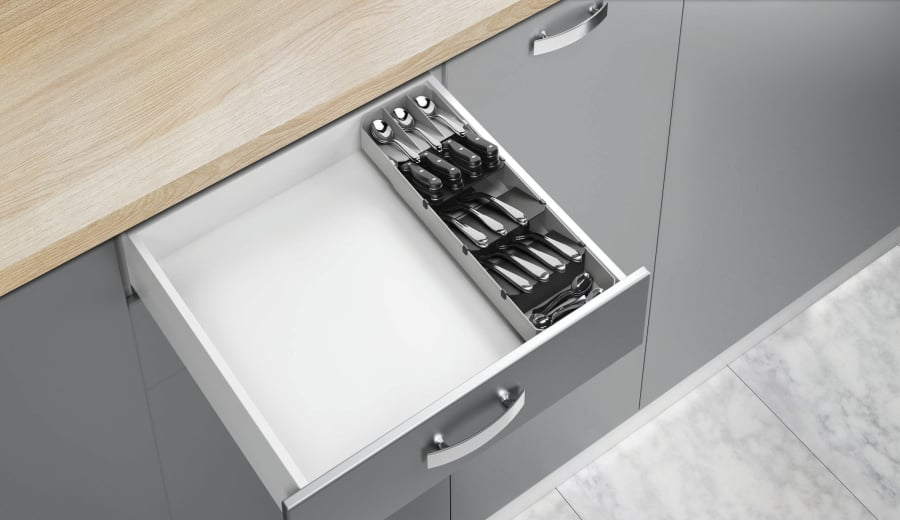 Der Metaltex Uni-Fit Besteck-Organizer ist ausziehbar zwischen 40 - 49 cm, hat variable Einlegefächer und ist für bis zu 90 Besteckteile geeignet.