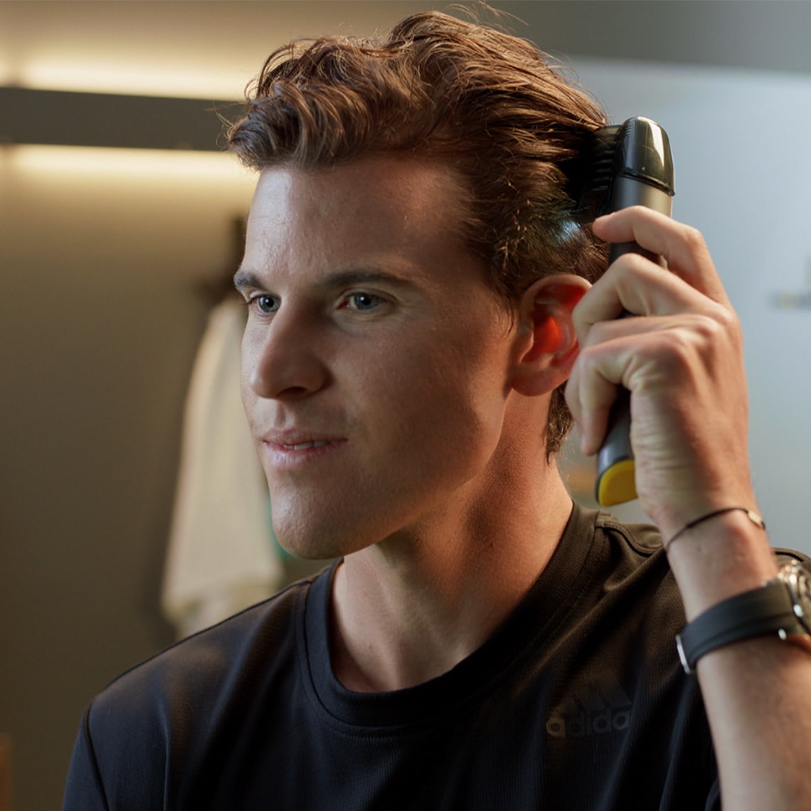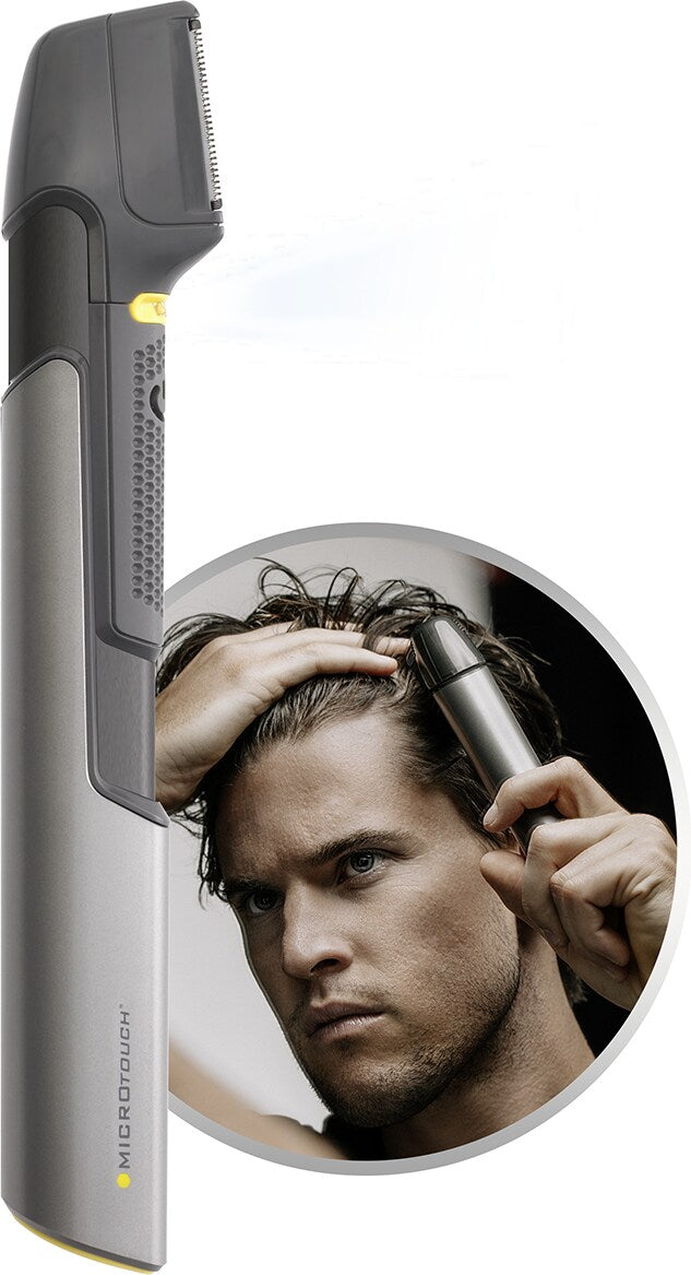 Schneidet, trimmt und faconiert spielend leicht individuelle Frisuren, Gesichts- und Körperhaar. Ihr perfekter Haarschnitt so einfach & schnell wie Haare kämmen. Die titanbeschichtete, berührungssichere Edelstahlklinge sorgt für optimale Ergebnisse. Die 5 Trimmaufsätze sind optimal für jede gewünschte Haarlänge und jeden Style - egal ob modischer oder klassischer Haarschnitt. Der Clou ist aber der ausziehbare Teleskopgriff - so erreichen Sie auch schwer erreichbare Stellen z.B. für Haarentfernung am Rücken. Die integrierte LED-Beleuchtung sorgt für maximale Präzision beim Stylen- und dabei geniessen Sie kabellose Bewegungsfreiheit. Ohr-Härchen, Koteletten, Nackenhaare und sogar wilde Frisuren werden gezähmt. Ein optimales Trockenstyling, denn es sind keine zusätzlichen Produkte notwendig - dabei ist er ein schlankes Leichtgewicht und somit praktisch auch für unterwegs und auf Reisen. Der ergonomisch geformter rutschfester Griff liegt super in der Hand und sorgt für optimalen Grip- Micro Touch Titanium Trim ist für Links- und Rechtshänder perfekt geeignet. Endlich unabhängig vom Friseurtermin immer gepflegt & gestylt aussehen. Inkl. praktischer Reinigungsbürste.