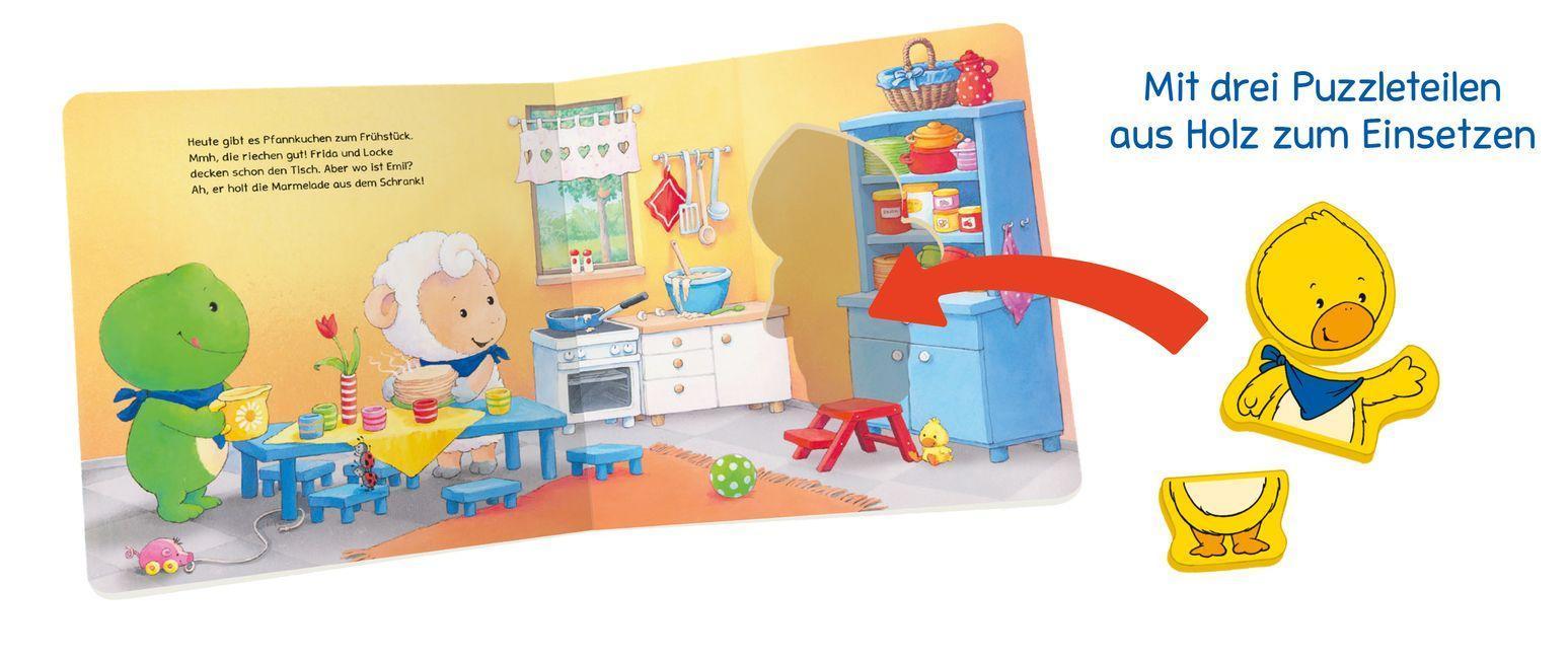 Kennst du Emil Ente? Emil ist überall dabei! Er hilft beim Pfannkuchenbacken und beim Äpfelernten, er spielt mit seinen Freunden mit der Eisenbahn und geht mit ihnen baden. Und natürlich will er auch dabei sein, wenn seine Freunde am Lagerfeuer sitzen und Stockbrot grillen. Aber wo ist Emil?Auf jeder Seite kann die lustige kleine Ente mit drei extrastabilen Puzzleteilen ins Bild eingesetzt werden. Alle Puzzleteile haben eine Vorder- und eine Rückseite. Welche Seite passt zu welcher Szene?Beim Spiel mit der kleinen Puzzle-Ente werden die Kinder aktiv in die Geschichte mit eingebunden. Ganz nebenbei trainieren sie spielerisch ihre Wahrnehmung und Feinmotorik. Und natürlich lädt die kleine Ente auch zum freien Spiel ohne Buch ein.Dieses Spielbuch ist genau auf die Entwicklung von Kleinkindern abgestimmt und besteht aus unbedenklichen Materialien. Es wurde von Pädagogen entwickelt und fördert Kinder altersgerecht und mit viel Spass!
