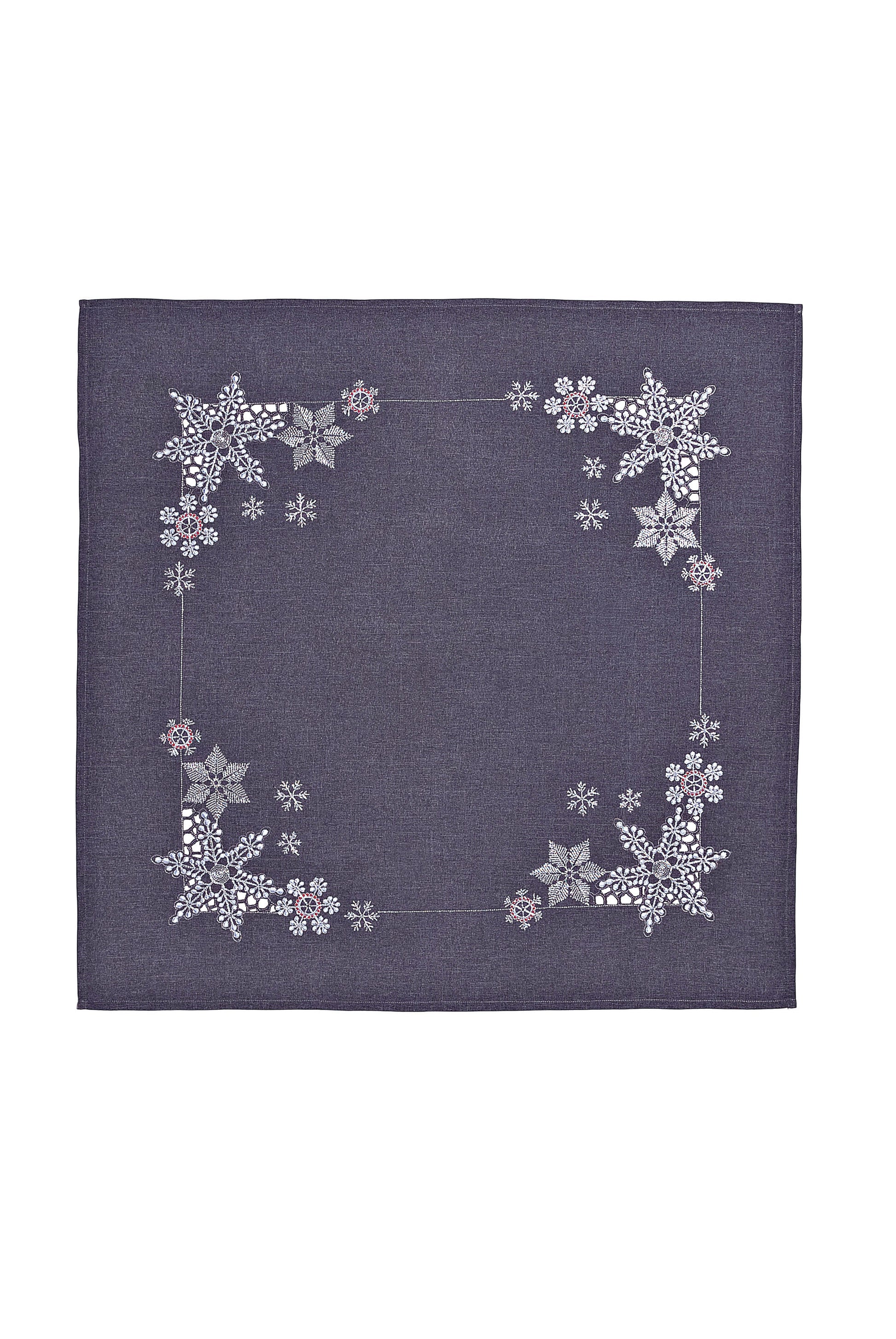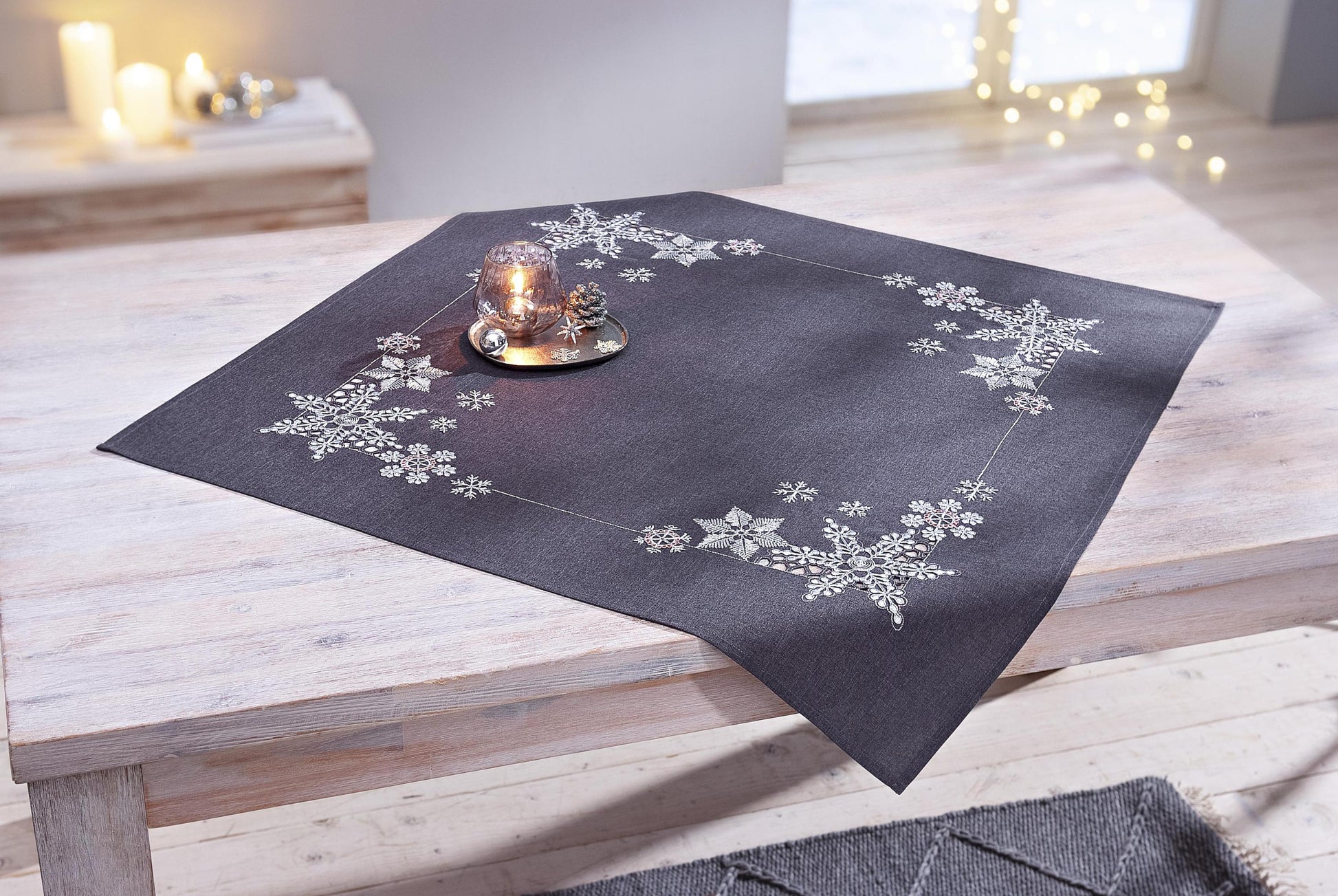 Ob als Hauptblickfang oder als glanzvolles „Centerpiece“ auf einer weissen Tischdecke – die Mitteldecke „Eisblumen“ bringt festliche Glanzmomente in Ihr Zuhause. Das stilvolle Anthrazit und die schöne Stoffqualität in edler Leinenstruktur fügen sich bestens in jedes Wohnambiente ein. Die gestickten Schneeflocken aus silbernem Glanzgarn und die zarten Durchbrüche machen die Mitteldecke den ganzen Winter hindurch zu einem festlichen Blickfang.
