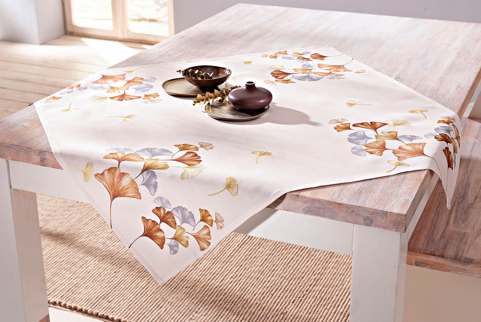 Setzen Sie wohnliche Akzente: Die Mitteldecke „Ginkgo“ passt glänzend auf Tisch & Tafel. Feine goldfarbene Stickereien machen die Tischwäsche zu einem edlen Wohn-Accessoire, das Ihren guten Geschmack unterstreicht.