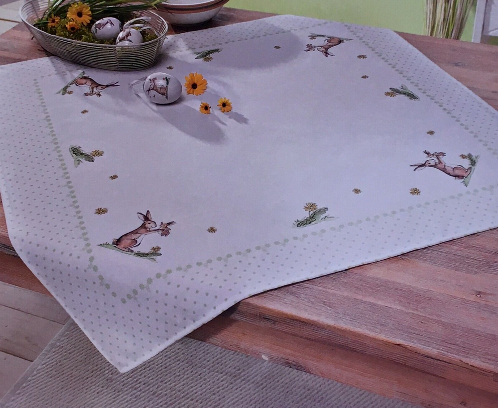 Tolles Design mit Hasen, kleinen Blümchen und einer Bordüre mit Punkten, rundum eingesäumt.