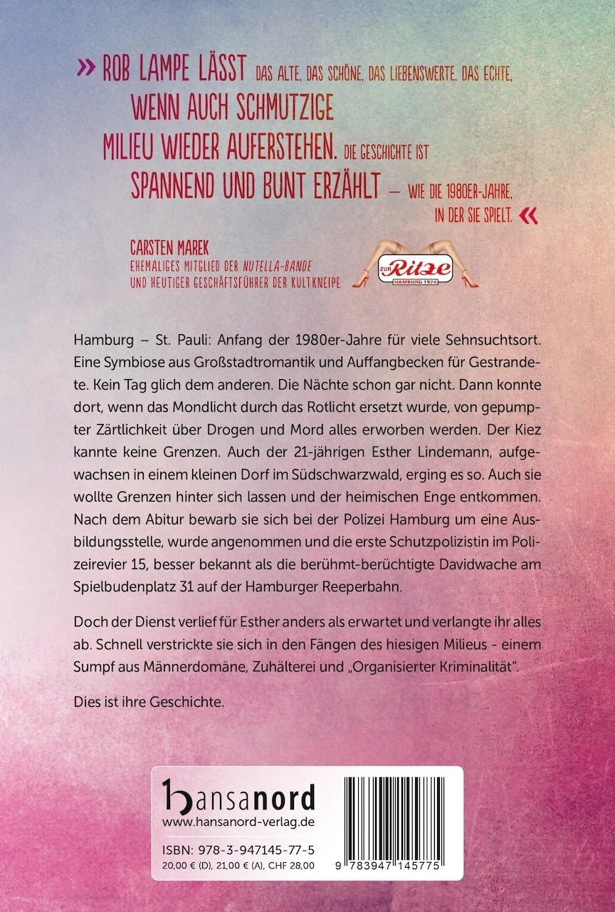 Hamburg - St. Pauli: Anfang der 1980er-Jahre für viele Sehnsuchtsort. Eine Symbiose aus Grossstadtromantik und Auffangbecken für Gestrandete. Kein Tag glich dem anderen. Die Nächte schon gar nicht. Dann konnte dort, wenn das Mondlicht durch das Rotlicht ersetzt wurde, von gepumpter Zärtlichkeit über Drogen und Mord alles erworben werden. Der Kiez kannte keine Grenzen.Auch der 21-jährigen Esther Lindemann, aufgewachsen in einem kleinen Dorf im Südschwarzwald, erging es so. Auch sie wollte Grenzen hinter sich lassen und der heimischen Enge entkommen. Nach dem Abitur bewarb sie sich bei der Polizei Hamburg um eine Ausbildungsstelle, wurde angenommen und die erste Schutzpolizistin im Polizeirevier 15, besser bekannt als die berühmt-berüchtigte Davidwache am Spielbudenplatz 31 auf der Hamburger Reeperbahn.Doch der Dienst verlief für Esther anders als erwartet und verlangte ihr alles ab. Schnell verstrickte sie sich in den Fängen des hiesigen Milieus - einem Sumpf aus Männerdomäne, Zuhälterei und "Organisierter Kriminalität".