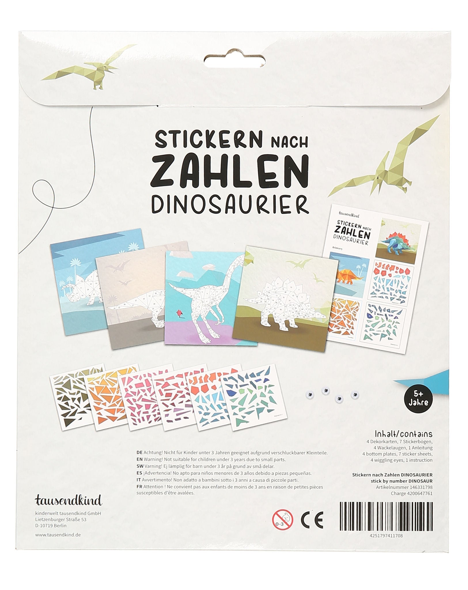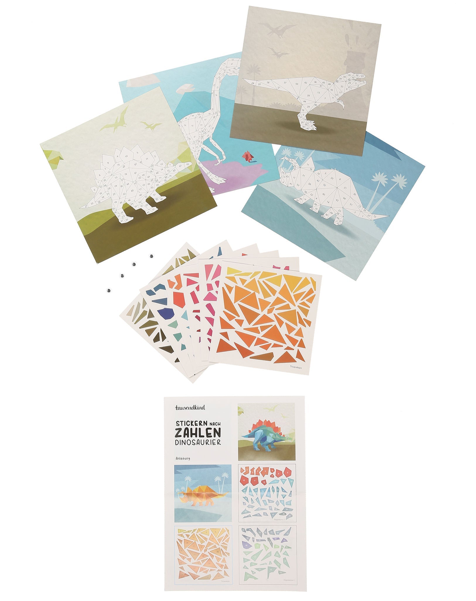Das Mosaik-Balstelset „Stickern nach Zahlen – Dinosaurier“ besteht aus 4 Motivkarten, 7 Stickerbögen, einem Bogen mit Wackelaugen und einer Anleitung.
