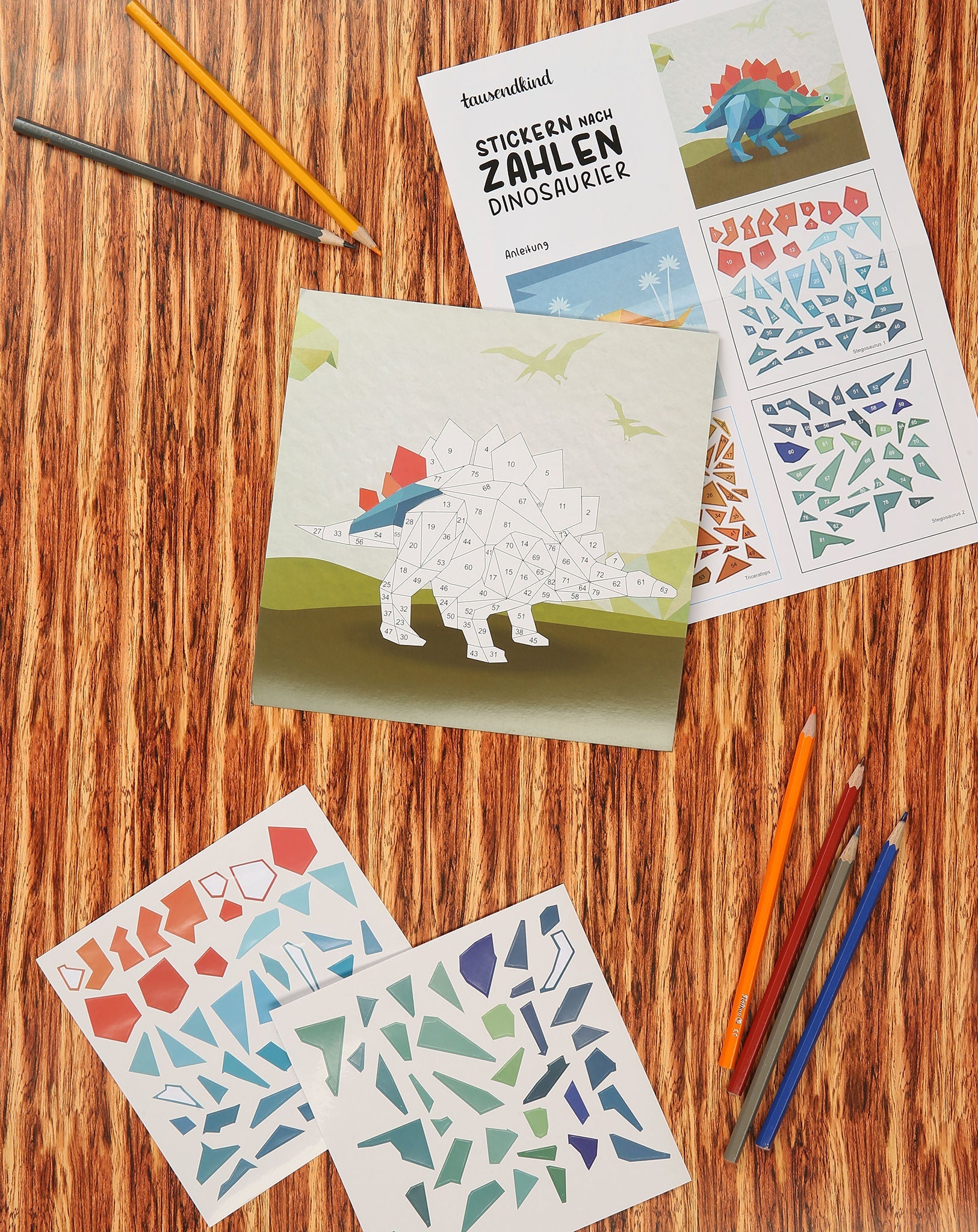 Mosaik-Bilder kleben ist für Kindern eine kurzweilige kreative Beschäftigung und fördert gleichzeitig die Konzentrationsfähigkeit. Bestellen Sie das Mosaikbastelset „Stickern nach Zahlen – Dinosaurier“ von tausendkind direkt hier.