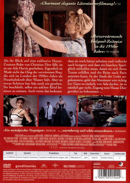 Als ihr Blick auf eine exklusive Haute-Couture-Robe von Christian Dior fällt, ist es um Ada Harris geschehen. Eigentlich ist Mode nicht das Ding der verwitweten Frau, die sich im London der 1950er-Jahre als Haushaltskraft über Wasser hält. Aber so etwas Schönes hat Ada noch nie gesehen. Sie beschließt, selbst ein solches Kleid besitzen zu müssen. Auch wenn das bedeutet, dass sie noch härter arbeiten und vielleicht auch hungern und dass ein bisschen Spielglück mithelfen muss, damit sie sich ihren Traum erfüllen und die Reise nach Paris antreten kann. In der Stadt der Liebe angekommen, geht das Abenteuer erst richtig los: Ganz so einfach, wie Ada dachte, ist es nämlich gar nicht, Zugang zum Hause Dior gewährt zu bekommen …