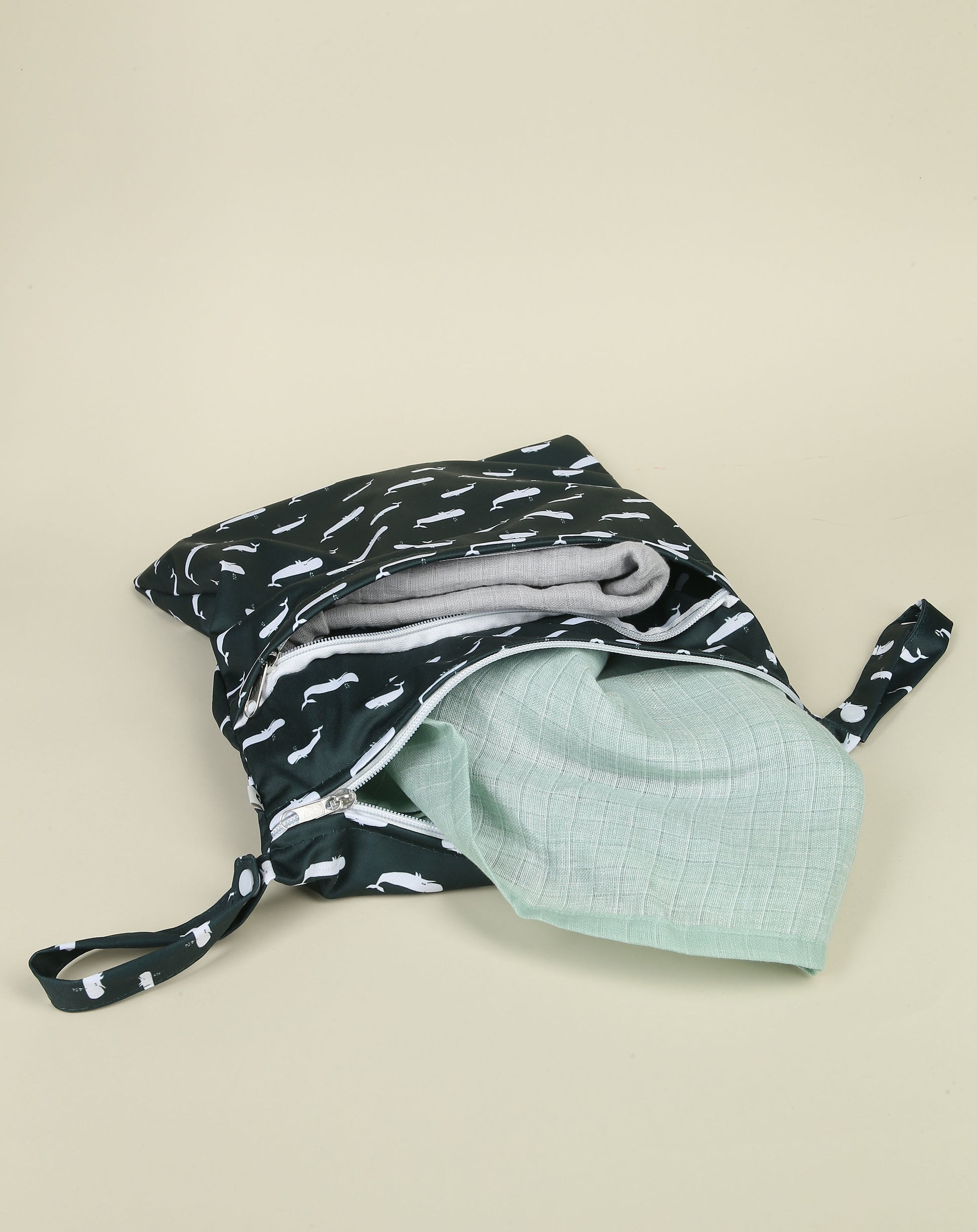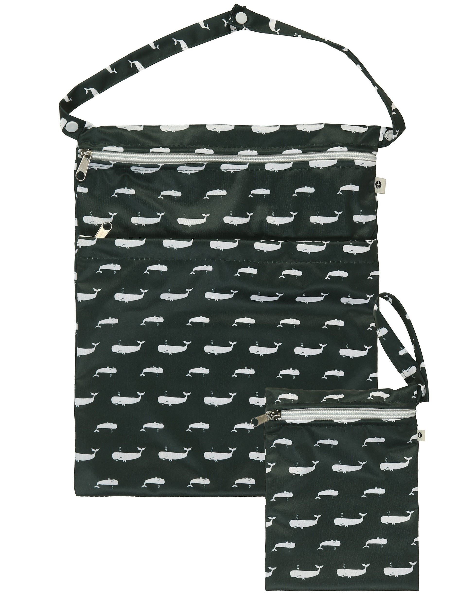 Handtuch, Badesachen, Duschbad, Windeln etc. werden in den Nasstaschen sicher verstaut und die Feuchtigkeit dringt nicht nach aussen. Grosse (36 x 30 cm) und kleine (20 x 15 cm) Reissverschlusstasche, mit Druckknopfschlaufen.
