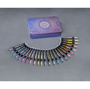Mit diesen magischen Markern können Sie mit einem Strich zwei Farben auf Papier zaubern. Die Marker schreiben in Silber (12 Stück) oder Gold (12 Stück) Metallic und sind außerdem mit 24 Farben gefüttert. Ideal für ausgefallene Kartenverzierungen, Fotoalben oder Scrapbooks oder für Handschriftliches. In einer eleganten Metallbox. Abmessungen: Schachtel 21,7 x 15,9 x 4 cm.