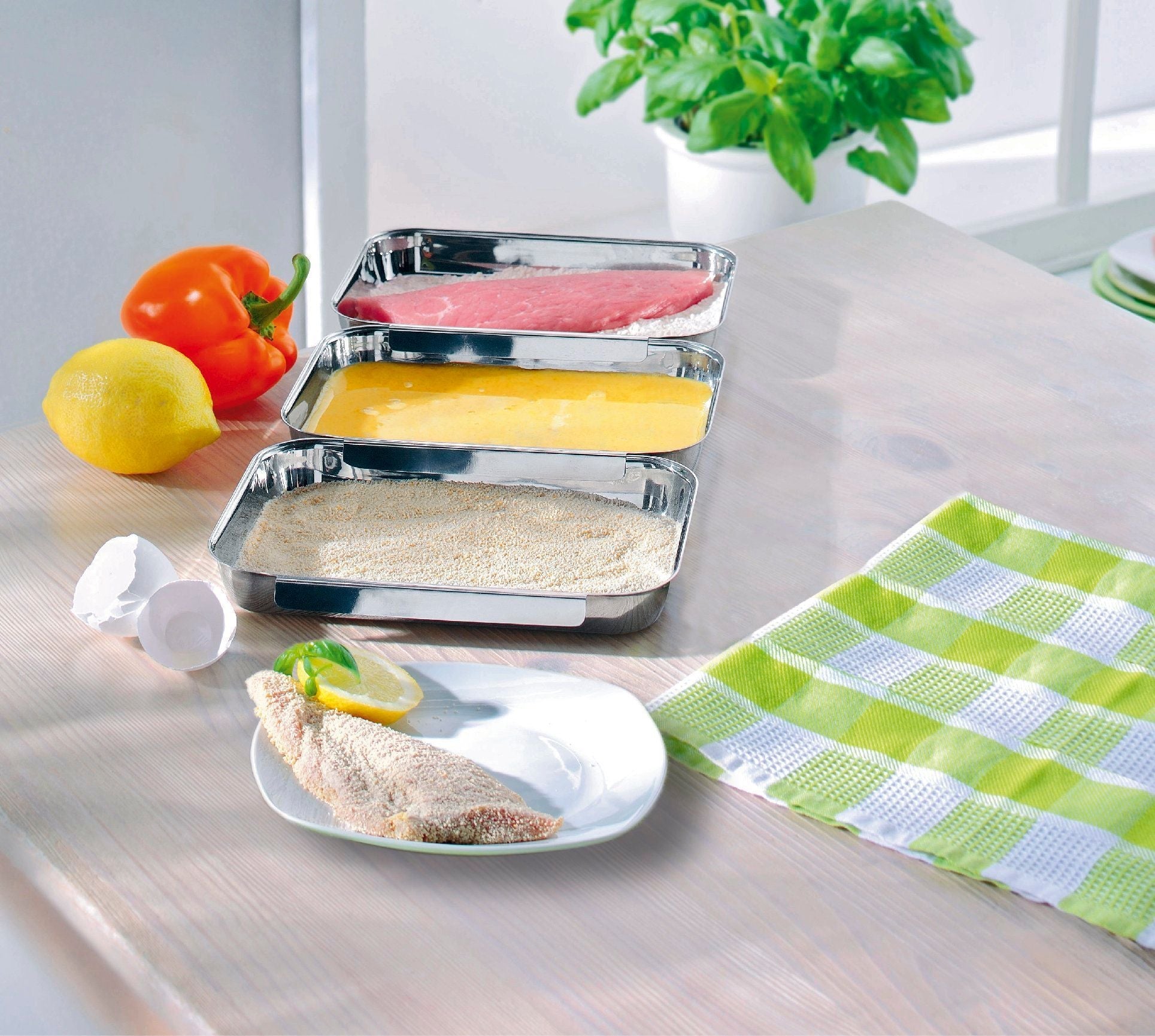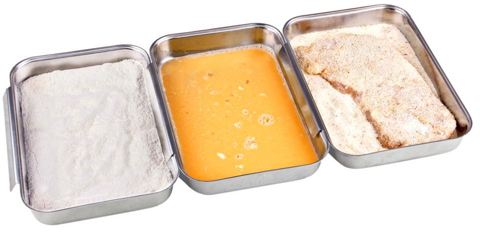 Das Panieren geht leicht von der Hand und Ihre Küche bleibt sauber. Die drei Schalen lassen sich aneinander hängen und bilden so eine nahtlose Panierstraße, auf der kein Mehl und keine Semmelbrösel verloren gehen können.