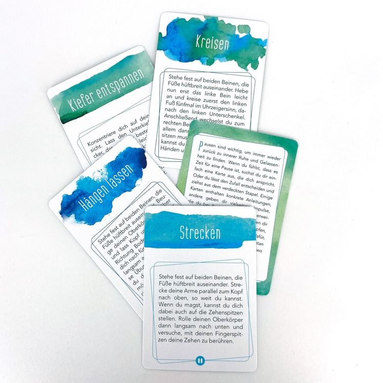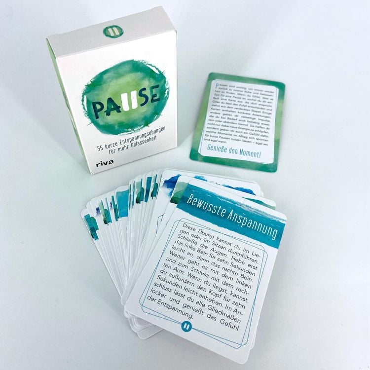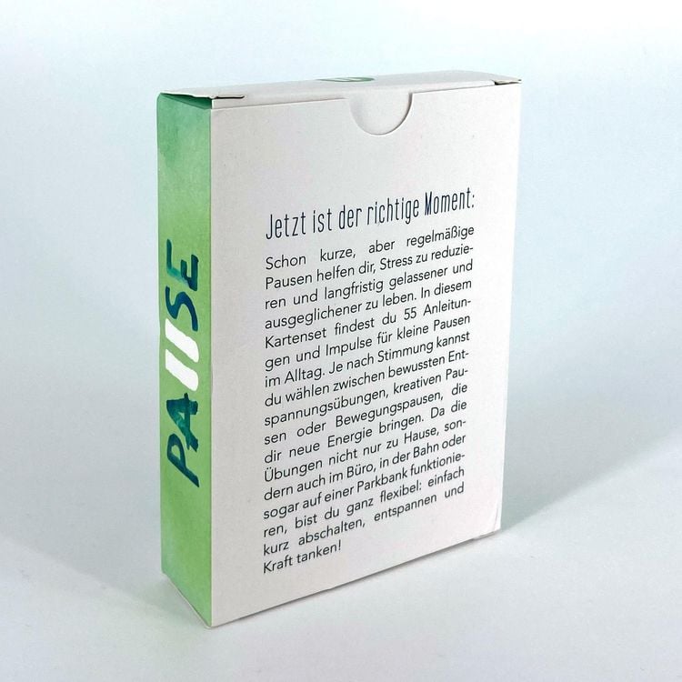 Jetzt ist der richtige Moment: Schon kurze, aber regelmäßige Pausen helfen dir, Stress zu reduzieren und langfristig gelassener und ausgeglichener zu leben. In diesem Kartenset findest du 55 Anleitungen und Impulse für kleine Pausen im Alltag. Je nach Stimmung kannst du wählen zwischen bewussten Entspannungsübungen, kreativen Pausen oder Bewegungspausen, die dir neue Energie bringen. Da die Übungen nicht nur zu Hause, sondern auch im Büro, in der Bahn oder sogar auf einer Parkbank funktionieren, bist du ganz flexibel: einfach kurz abschalten, entspannen und Kraft tanken!