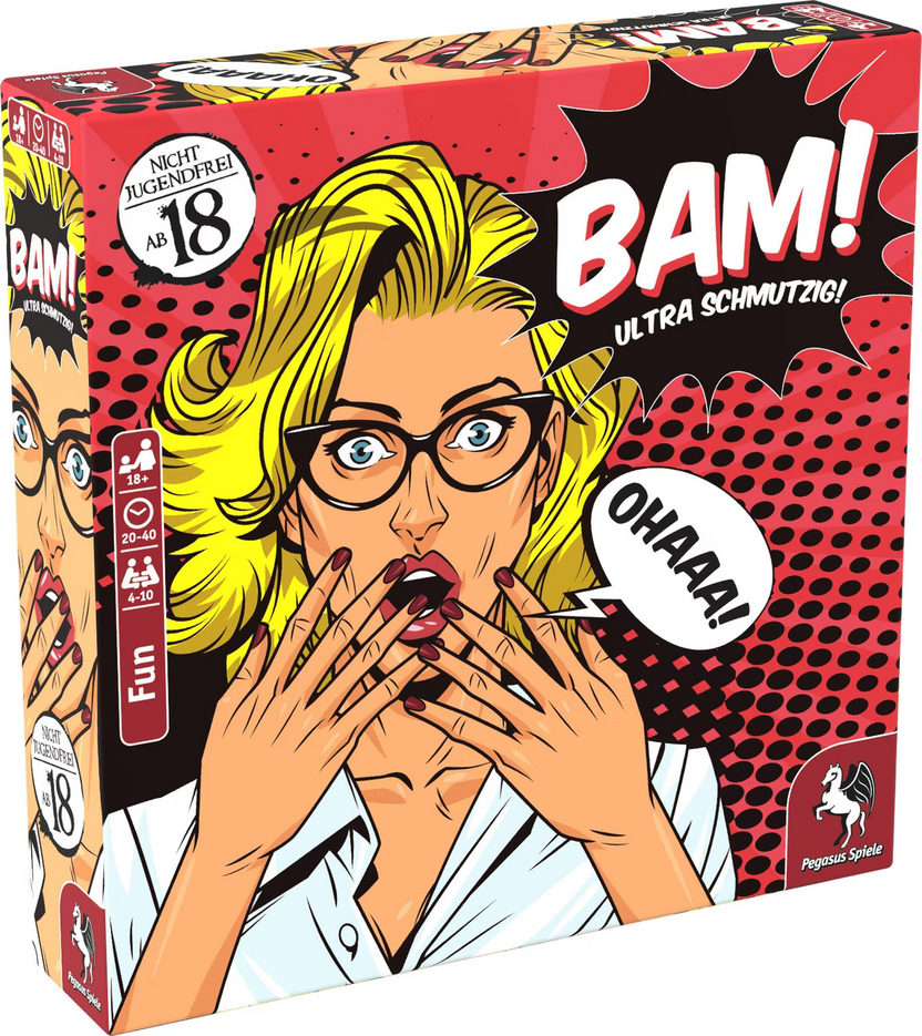Wenn ihr euch schon immer gedacht habt: Alles was ich will ist BAM!, dann kommt ihr jetzt voll auf eure Kosten: Mit BAM! Ultra schmutzig gibt es das Beste aus dem Grundspiel und den beiden eigenständigen Erweiterungen in einer bombastischen Compilation Box mit über 700 Karten – und das auch noch zu einem unschlagbar guten Preis. Frei nach dem Motto: Wenn schon schmutzig, dann richtig schmutzig! Und zur Feier dieses unanständig guten Rundum-Sorglos-Pakets gibt es auch noch ein BAMtastisches neues Coverartwork oben drauf. Natürlich liegen dem Spiel wie immer auch ein paar Blankokarten bei, die die Spielenden mit ihren besten eigenen Ideen versehen können.