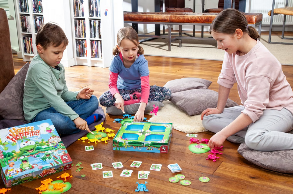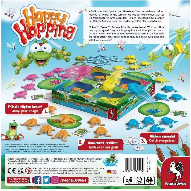 Was für ein Chaos! In Happy Hopping springen die Frösche kreuz und quer durch die Tümpel! Alle sind auf der Jagd nach den bunten Mücken. Welche Frösche fangen dabei die meisten?