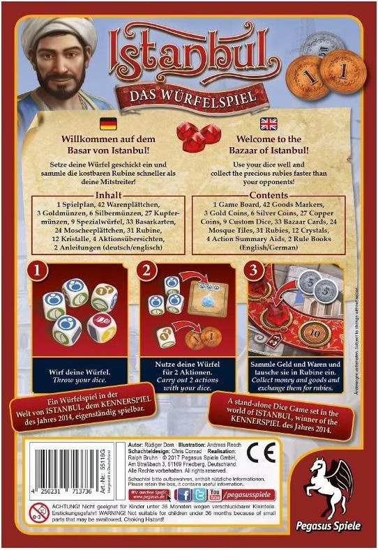 Willkommen auf dem Basar von Istanbul! Als gewiefte Kaufleute versuchen die Spieler ihre Konkurrenz auszustechen, um Meister der Handelsgilde zu werden. Runde für Runde wetteifern sie geschickt miteinander um Geld und Waren. Unterstützung erhalten sie dabei von ihren treuen Assistenten, repräsentiert durch hübsche Sonderwürfel. Ihr Einkommen weise einsetzend können die Spieler in verbesserte Fähigkeiten investieren oder direkt die heißbegehrten Rubine einkaufen. Mit ein bisschen Glück und der richtigen Strategie, wird es schließlich einem Spieler gelingen, vor seinen Rivalen die erforderliche Anzahl an Rubinen einzusammeln. Wer hat das Zeug dazu, Meister der Handelsgilde zu werden?