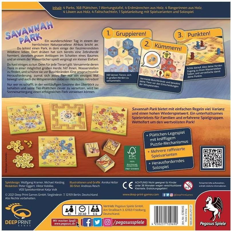 Savannah Park ist ein interaktives Puzzle mit wunderschönem Artwork von Annika Heller. Das Brettspiel des vielfach ausgezeichneten Spieldesign-Duos Wolfgang Kramer und Michael Kiesling bietet mit einfachen Regeln Spielspaß für Familien, erfahrene Spielegruppen und Solospiele. Varianten sorgen für neue Herausforderungen und einen hohen Wiederspielreiz.