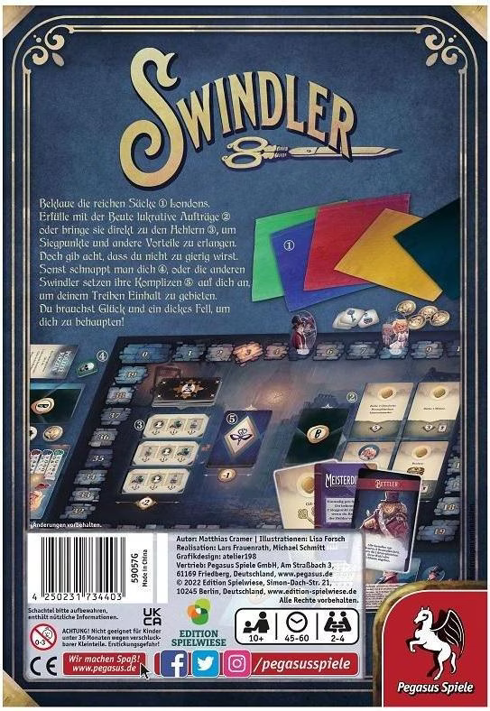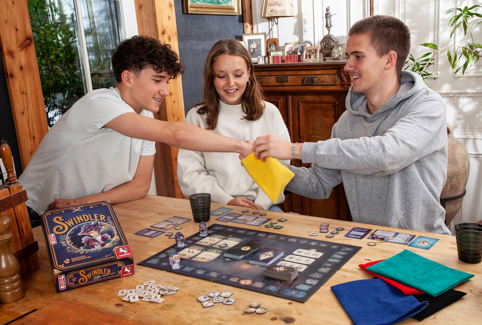 Bei Swindler geht es den „reichen Säcken“ an den Kragen bzw. Geldbeutel. Dabei ziehen die Spielenden Schätze aus verschiedenen Stoffsäcken. Die Beute verkaufen sie entweder direkt an Hehler oder sie nutzen sie, um lukrative Aufträge zu erfüllen, um zum Meisterdieb bzw. zur Meisterdiebin zu werden. Doch Achtung: Manch feiner Schnösel ist aufmerksamer, als gedacht. Eine falsche Bewegung und die ganze schöne Beute ist futsch!
