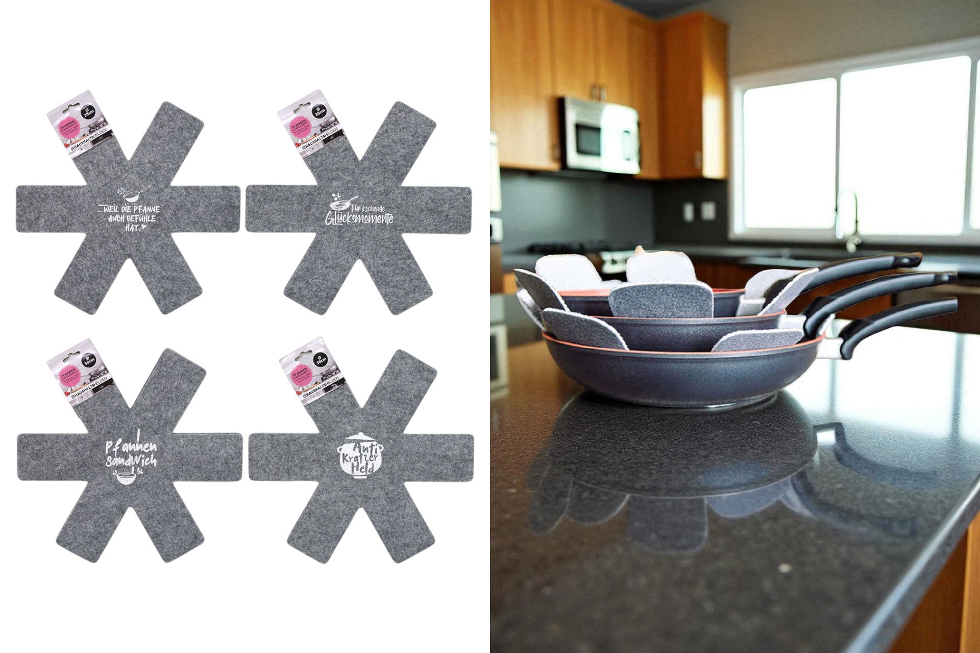 Mit einem Durchmesser von 38 cm sind diese praktischen Pfannen-Schutzfilme für nahezu alle Topf- und Pfannengrössen geeignet und damit ein unverzichtbares Küchenutensil. Egal, ob man den Filz flach hinlegt oder aufgerollt an den Seiten platziert, die zwei Pfannen-Schutzfilme bieten im täglichen Gebrauch optimalen Schutz für geliebtes Kochgeschirr.