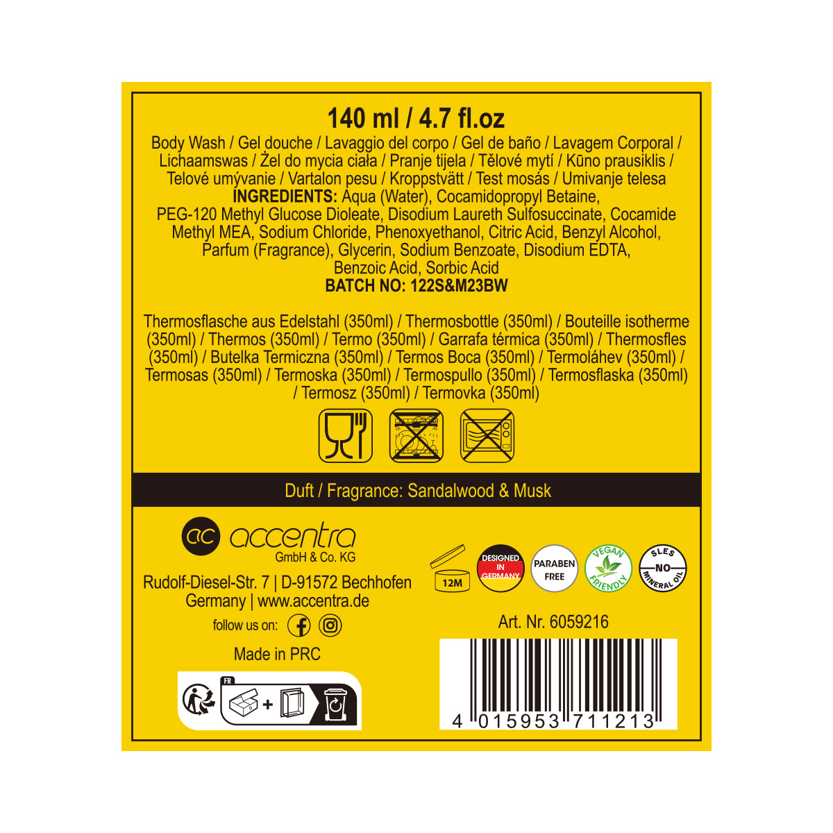 Entdecken Sie das Accentra Pflegeset für Männer, die Entspannung und Stil schätzen. Dieses hochwertige Set enthält ein 140 ml Körperwaschmittel mit dem verführerischen Duft von Sandelholz und Moschus, das Ihre Sinne belebt und die Haut sanft reinigt. Ergänzt wird das Set durch eine elegante 350 ml Thermosflasche aus Edelstahl, die nicht nur praktisch ist, sondern auch für unterwegs ideal geeignet ist. Gönnen Sie sich oder einem besonderen Menschen dieses durchdachte Geschenkset und verwandeln Sie das Badezimmer in eine Oase der Ruhe und Erfrischung.