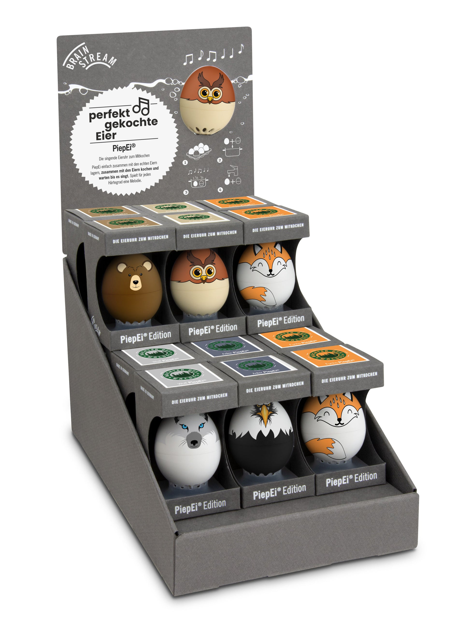 Mit dem PiepEi® macht das Eierkochen richtig Spass und gewinnt auf jeden Fall an Unterhaltungswert. Denn bei jedem erreichten Härtegrad (weich, mittelweich und hart) ertönt eine andere Melodie.