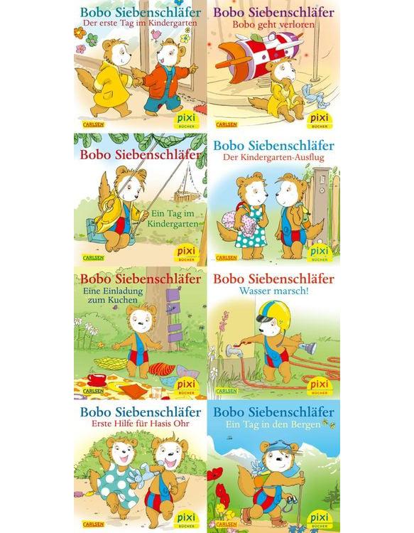 Die Bildergeschichten rund um den kleinen Bobo Siebenschläfer sind echte Kinderbuchklassiker. Diese acht Geschichten im Pixi-Format begleiten Bobo durch den Alltag: Bobo geht in den Kindergarten, verreist in die Berge, besucht die Feuerwache oder den Badesee. Dabei ist er immer aufgehoben im liebevollen Kreis der Kindergartenfreunde und der Familie. Sehr warme Geschichten für ganz Kleine. In der Pixi-Serie "Neues von Bobo" sind folgende Bücher enthalten: Bobo Siebenschläfer - Der erste Tag im Kindergarten Bobo Siebenschläfer - Bobo geht verloren Bobo Siebenschläfer - Ein Tag im Kindergarten Bobo Siebenschläfer - Der Kindergarten-Ausflug Bobo Siebenschläfer - Eine Einladung zum Kuchen Bobo Siebenschläfer - Wasser marsch! Bobo Siebenschläfer - Erste Hilfe für Hasis Ohr Bobo Siebenschläfer - Ein Tag in den Bergen