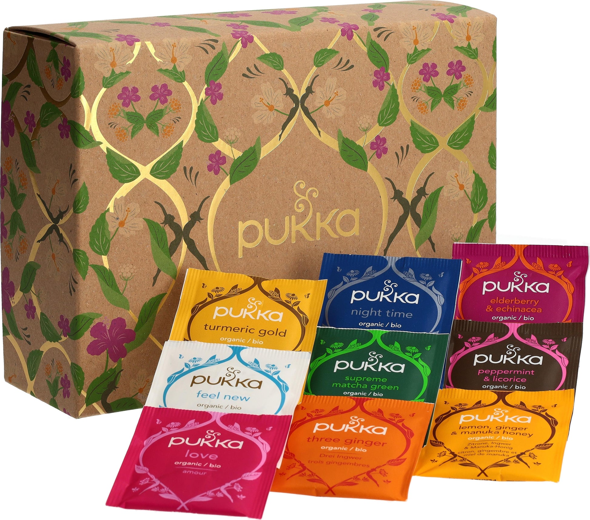 Die grösste Auswahl an Pukka Wohlfühlmomenten: 9 liebevoll ausgewählte Bio-Tees (jeweils 5 Teebeutel) für die Auswahl zu Hause oder zum Verschenken.