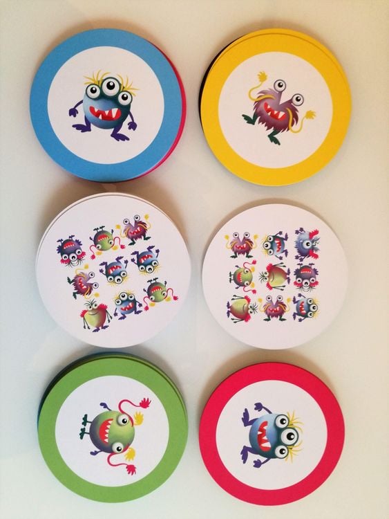 Monster, überall Monster! Doch nicht überall die gleichen. Wer richtig scharf hinschaut und sein Feld von neun runden Monsterkarten so ordnet, wie es die Aufgabe vorgibt, der gewinnt. Ein rasend schnelles Kinder- und Familienspiel mit der 1000-Runden-Nochmal-Garantie. MONSTER BOX ist ein ganz neues und ganz schnelles Reaktions- und Konzentrationsspiel für Kinder ab 8 Jahren. Und das geht so: Jeder Spieler nimmt einen Satz gleichfarbiger Spielerkarten und legt sie vor sich in einem Quadrat von 3 x 3 Karten aus. Die Aufgabenkarten werden gemischt, auf einen Stapel gelegt und die oberste Karte wird umgedreht. Platziere deine Karten so schnell wie möglich gemäß der Aufgabenkarte, um diese als Siegpunkt zu ergattern. Und denke dran: Auf der Rückseite deiner Monsterkarten sind auch noch Bilder, die dir vielleicht aus der Patsche helfen... Ein monsterschneller Spaß für die ganze Familie.