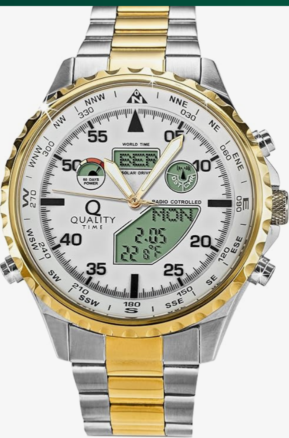 Zuverlässig und sekundengenau: QT Herren Funk Solar World Timer „Boston Bicolor“ Legen Sie Wert auf Pünktlichkeit! Mit dieser markanten Armbanduhr haben Sie die Uhrzeit jederzeit im Blick. Ob im Beruf oder in der Freizeit: Die Uhr hilft Ihnen Ihre Termine rechtzeitig wahrzunehmen.