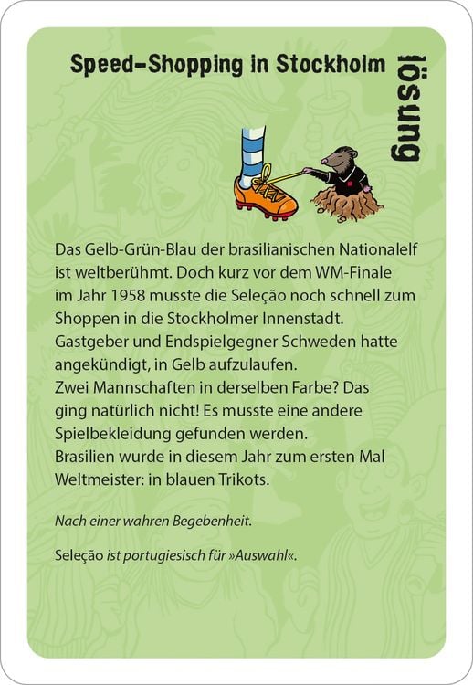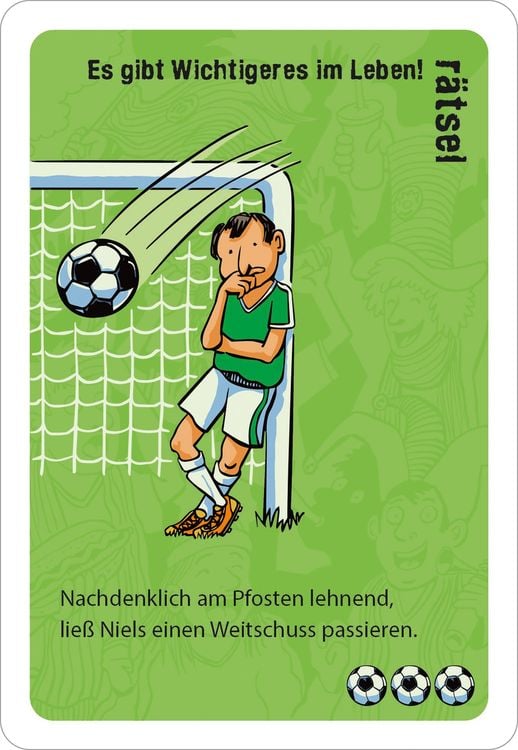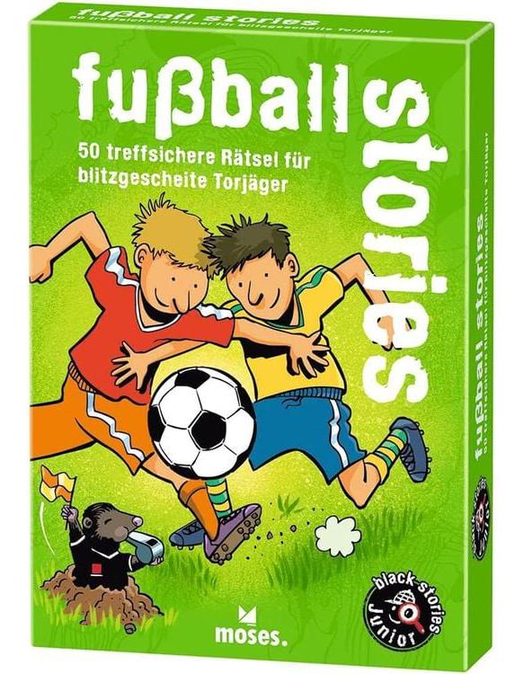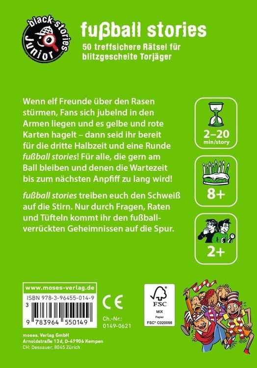 Warum musste ein Mann ins Krankenhaus, nachdem er einen Ball trat? Weshalb freute Ingo sich nicht, obwohl er zwei Treffer erzielt hatte? Und wie kann es sein, dass das erste Tor in dieser Partie schon vor dem Anpfiff gefallen ist? Wenn elf Freunde über den Rasen stürmen, Fans sich jubelnd in den Armen liegen und es gelbe und rote Karten hagelt – dann ist es Zeit für eine dritte Halbzeit und eine Runde fußball stories. Die fußball stories versammeln 50 treffsichere Rätsel für blitzgescheite Torjäger, die auch dem scharfsinnigsten Ratefuchs die Schweißperlen auf die Stirn treiben. Egal, ob scharfe Schüsse, beinharte Blutgrätschen oder knifflige Kopfbälle: In diesen fußballverrückten Rätselgeschichten passieren haarsträubende Dinge, deren Geheimnisse man nur durch Fragen, Raten und Tüfteln lüften kann. Für alle, die gern am Ball bleiben und denen die Wartezeit bis zum nächsten Anpfiff zu lang wird, ist diese black stories Junior Edition genau das Richtige. 1991 startet der moses. Verlag GmbH als kleiner Kinderbuchverlag. Im Laufe der Jahre entwickelte moses. Ihre Klassiker: Die Becherlupe, die rabenschwarzen "black stories" sowie ihren umfangreichen Produktkatalog