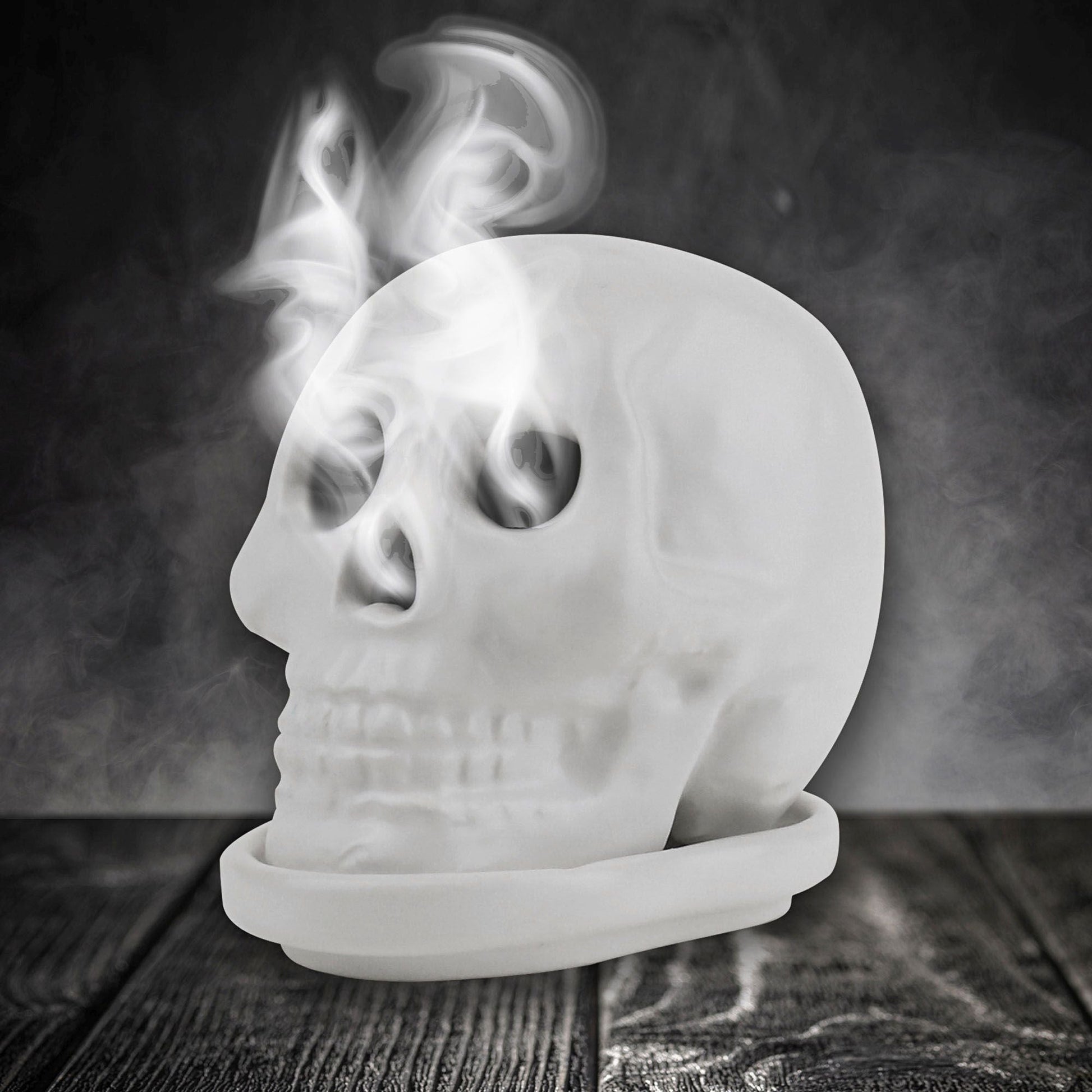Äußerst effektvoll: Dieser Totenkopf aus Porzellan ist ein echter Eyecatcher. Einfach eine Räucherkerze auf den Untersetzer stellen und den aromatischen Rauch aufsteigen lassen. Perfekt für (Halloween-)Partys und für alle, die es mystisch-düster lieben.