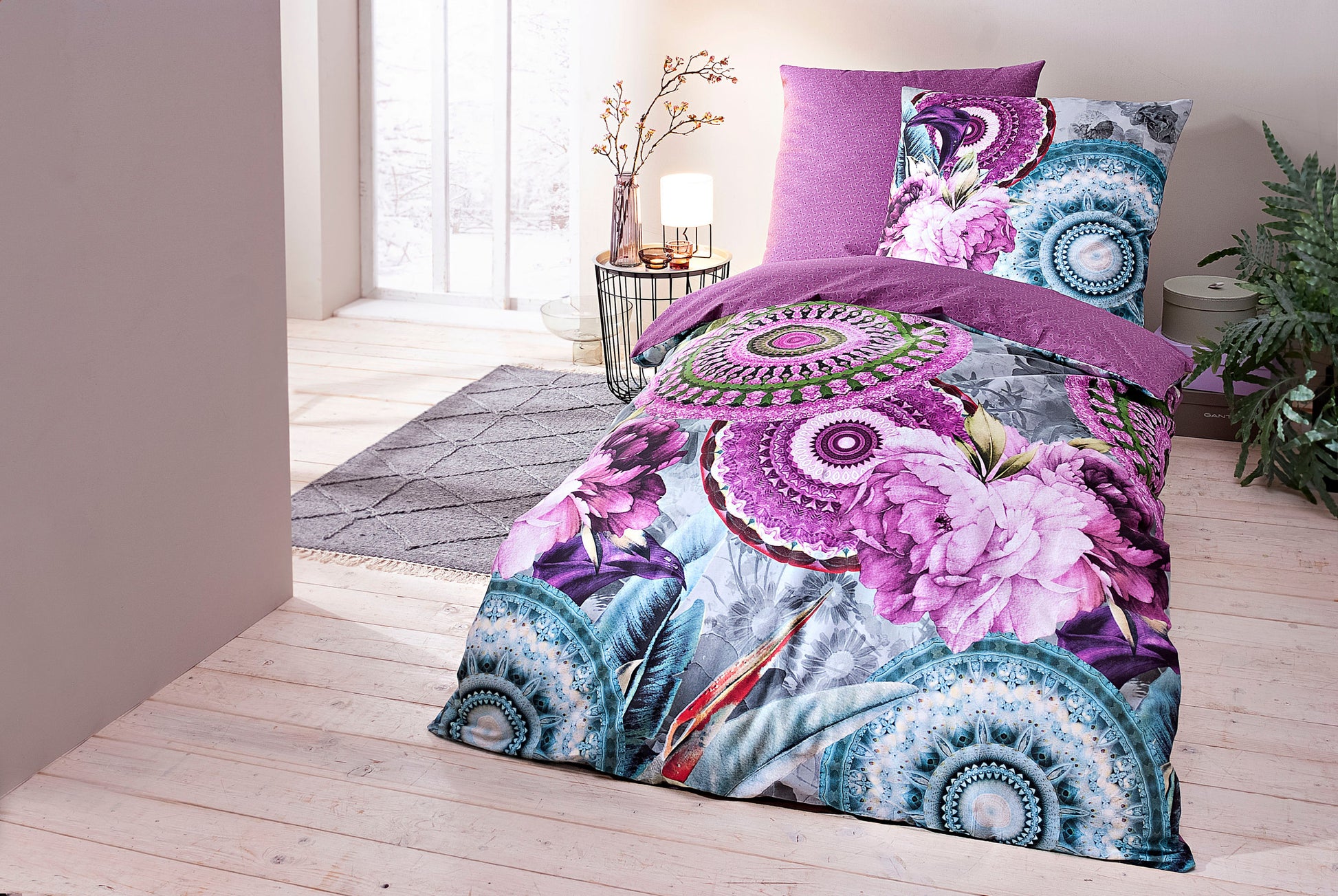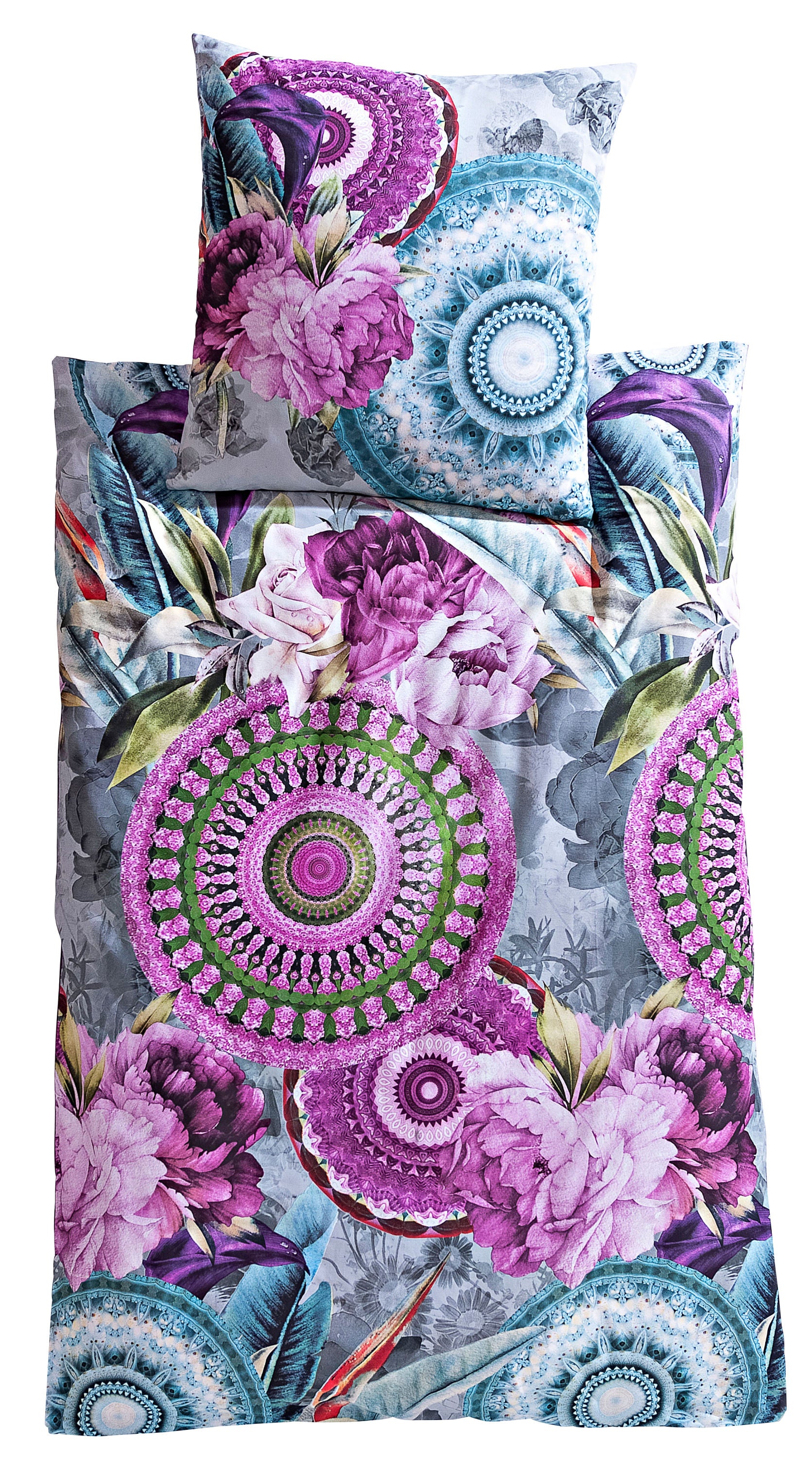 Kunstvolle Mandalas und prächtige XL-Blüten verbreiten eine Atmosphäre wie im Paradiesgarten und machen Ihr Bett auch tagsüber zum bildschönen Blickfang. Und wenn es Ihnen mal zu bunt wird, drehen Sie die Bettwäsche einfach um: die Ton in Ton gemusterte Rückseite setzt einen ruhigen Kontrast.