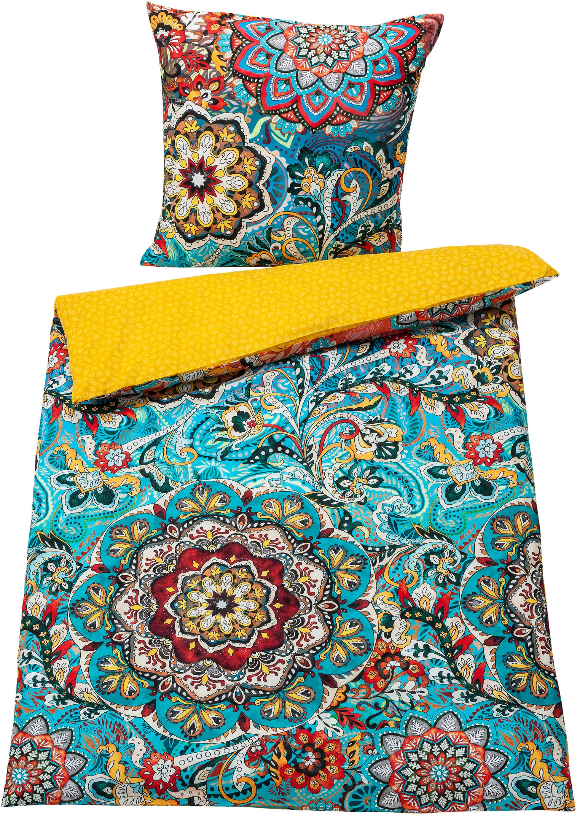 Passen Sie Ihre Bettwäsche Ihrer Stimmung an, ganz wie Sie es wünschen: Lebhaft, bunt und fröhlich oder sanft und dezent? Da die Wendebettwäsche zwei wunderschöne Seiten hat, haben Sie immer die Wahl, welchen Look Sie möchten: Der Mandala-Print auf der Vorderseite ist in intensiv-leuchtenden Farben (Türkis, Grün, Bordeaux) gestaltet. Die Rückseite in warmem Goldgelb ist mit elegantem Paisleymuster in Weiss bedruckt.