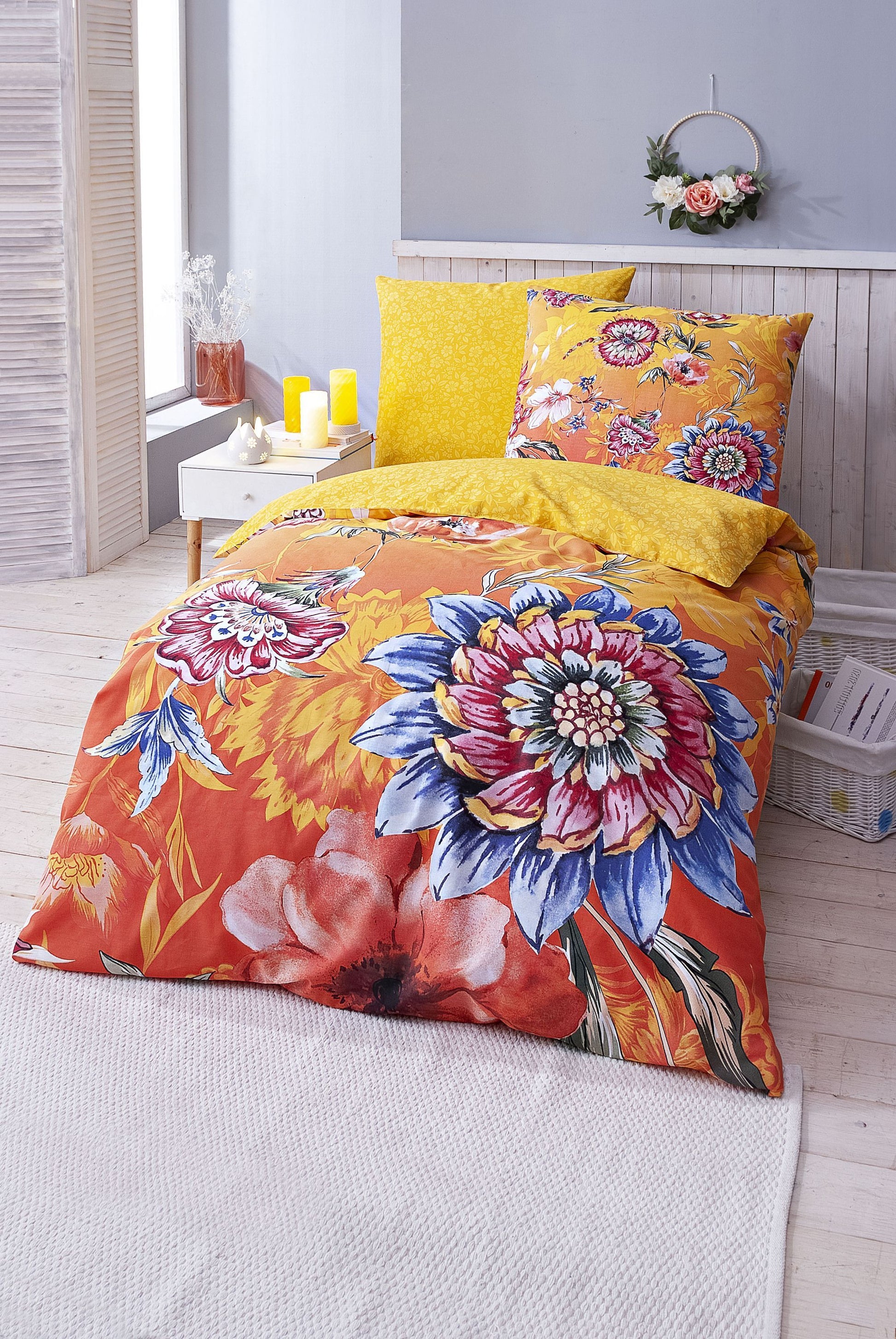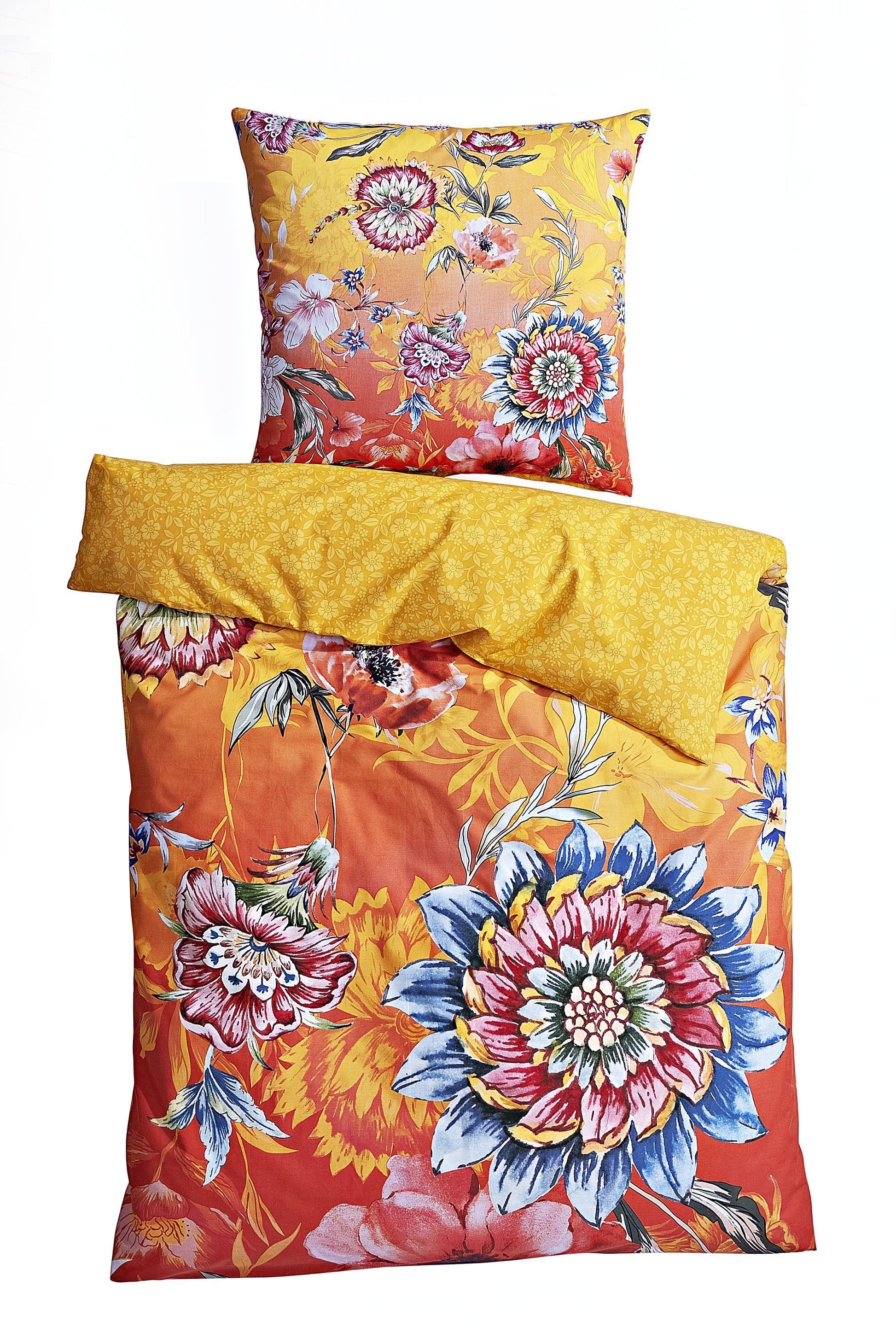 Diese Bettwäsche können Sie drehen und wenden, wie Sie möchten: sie sieht immer schick aus und ist ein bildschöner Blickfang im Schlafzimmer. Auf der einen Seite ist auf kräftigem Orange ein grossformatiges Blumenmuster zu bewundern, wie von Künstlerhand gemalt. Auf der anderen Seite geht es etwas ruhiger zu: Ton in Ton reihen sich kleinere Blüten in Sonnengelb und hellem Orange aneinander.