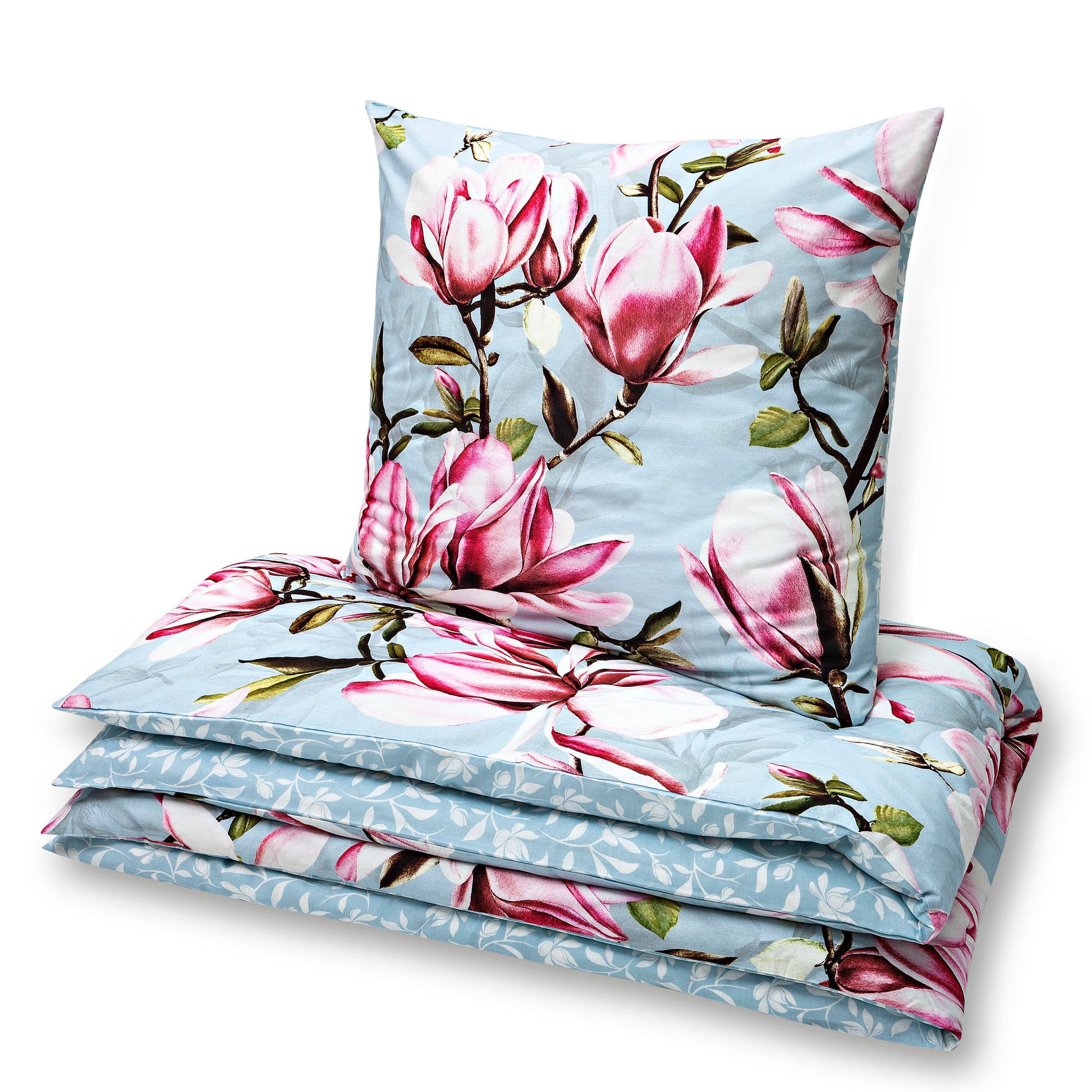 Wie Sie es auch drehen und wenden: diese Garnitur ist immer ein zauberhafter Blickfang für Ihr Schlafzimmer. Auf einer Seite erblühen grosse rosa Magnolien auf himmelblauem Grund, auf der anderen Seite zieren allover weisse Blumensilhouetten die hellblaue Bettwäsche.