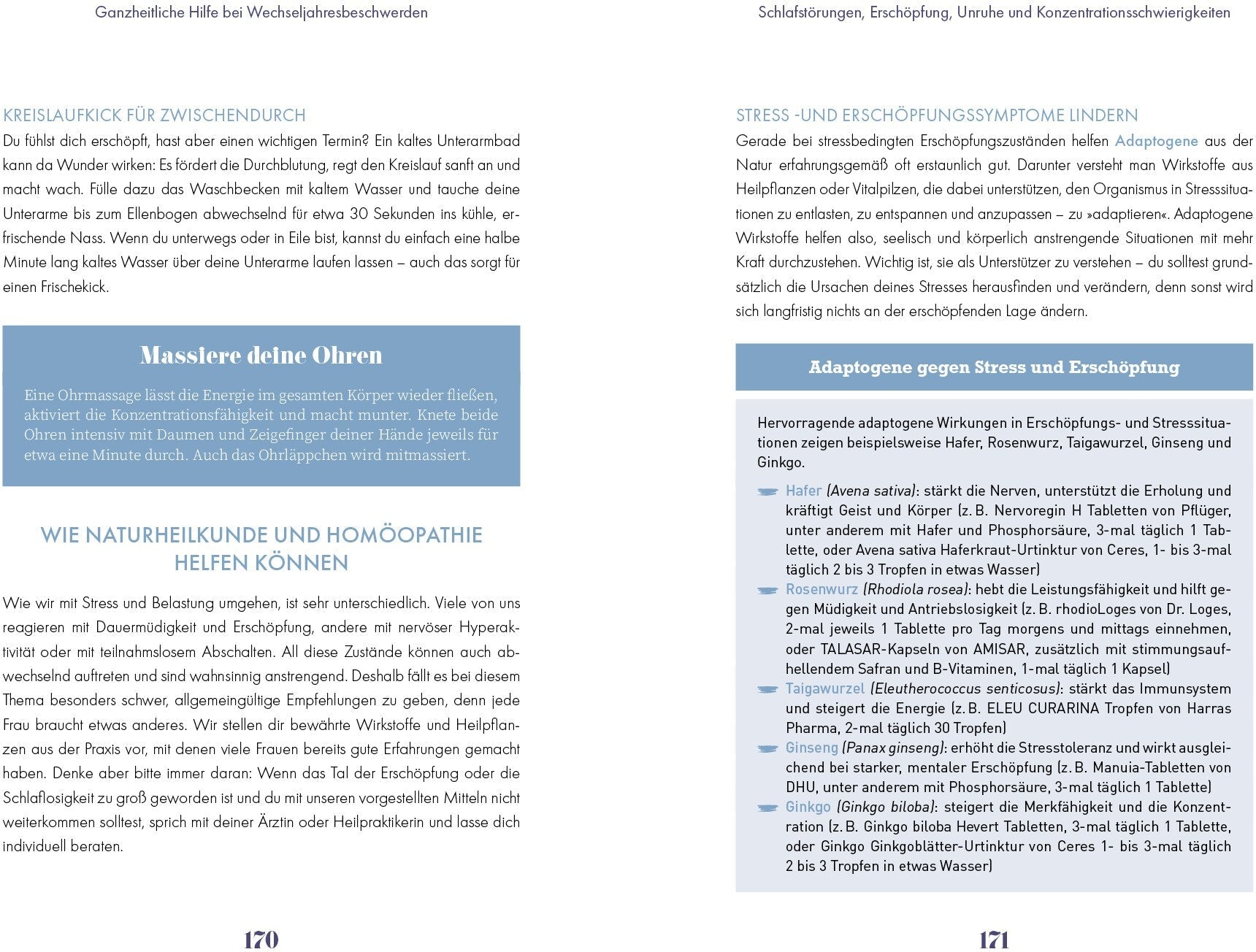 Neben naturheilkundlichen Mitteln wie den sogenannten Phytohormonen liefert der Guide jede Menge Ernährungsempfehlungen, Atem- und Entspannungsübungen, praktische Alltagstipps sowie Hilfe für die gestresste Seele. Daraus kann jede Frau die für sich passenden Maßnahmen zusammenstellen - ganz gleich, um welche Beschwerde es geht: