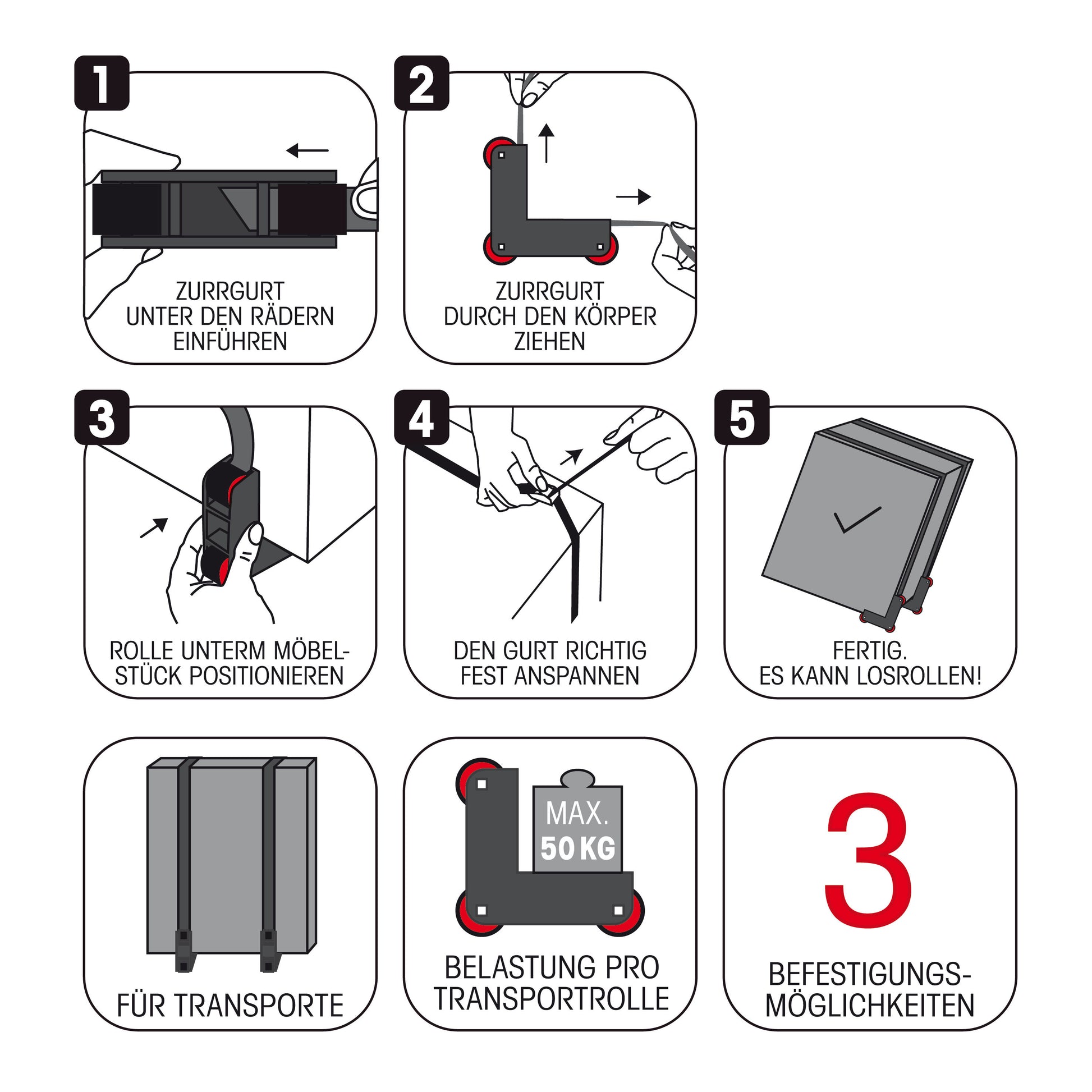 - Jede Transportrolle belastbar bis 50 kg
