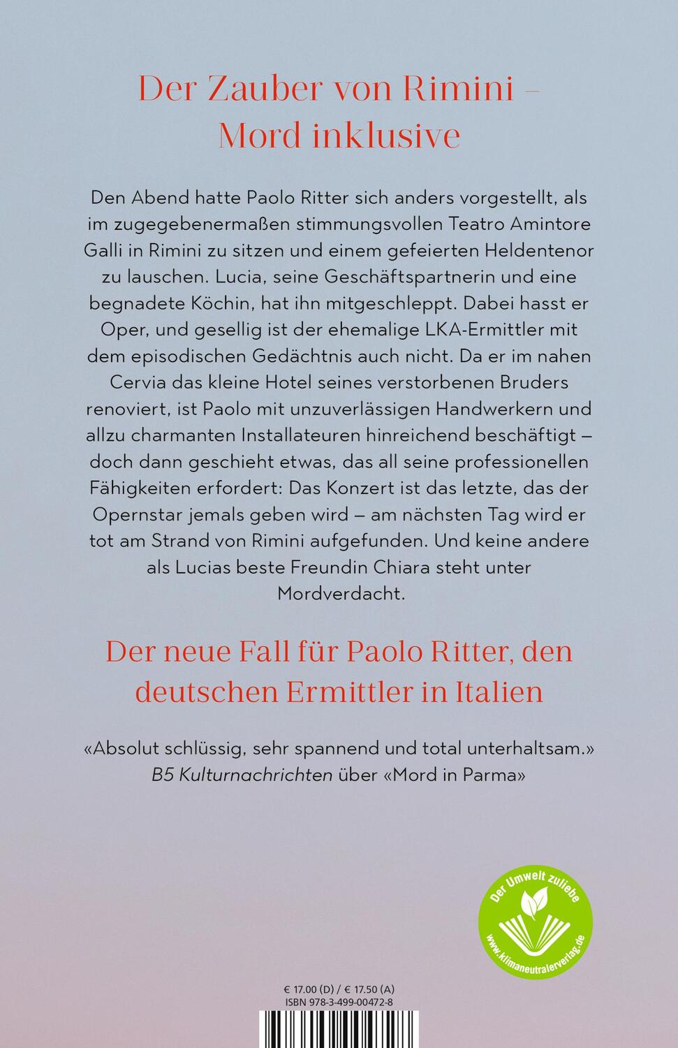 Den Abend hatte Paolo Ritter sich anders vorgestellt, als im zugegebenermaßen stimmungsvollen Teatro Amintore Galli in Rimini zu sitzen und einem gefeierten Heldentenor zu lauschen. Lucia, seine Geschäftspartnerin und eine begnadete Köchin, hat ihn mitgeschleppt. Dabei hasst er Oper, und gesellig ist der ehemalige LKA-Ermittler mit dem episodischen Gedächtnis auch nicht. Da er im nahen Cervia das kleine Hotel seines verstorbenen Bruders renoviert, ist Paolo mit unzuverlässigen Handwerkern und allzu charmanten Installateuren hinreichend beschäftigt - doch dann geschieht etwas, das seine ganzen Fähigkeiten als Ermittler erfordert: Das Konzert ist das letzte, das der Opernstar jemals in seinem Leben geben wird - am nächsten Tag wird er tot am Strand von Rimini aufgefunden. Und keine andere als Lucias beste Freundin Chiara, die als Letzte mit dem Toten zusammen war, steht unter Mordverdacht.