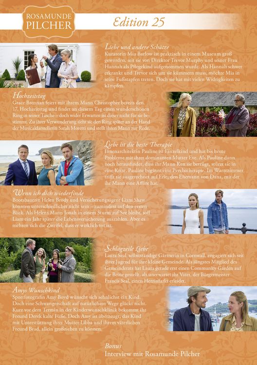 Rosamunde Pilcher Edition 25: • Liebe und andere Schätze • Hochzeitstag • Liebe ist die beste Therapie • Wenn ich dich wiederfinde • Schlagzeile Liebe • Amys Wunschkind Liebe und andere Schätze Kuratorin Mia Barlow ist praktisch in einem Museum groß geworden, seit sie von Direktor Trevor Murphy und seine Frau Hannah als Pflegekind aufgenommen wurde. Als Hannah schwer erkrankt und Trevor sich um sie kümmern muss, möchte Mia in seine Fußstapfen treten. Doch sie hat mit vielen Widrigkeiten zu kämpfen. Hochzeitstag Grace Brennan feiert mit ihrem Mann Christopher bereits den 17. Hochzeitstag und findet an diesem Tag einen wunderschönen Ring in seiner Tasche - doch wider Erwarten ist dieser nicht für sie bestimmt. Zu ihrer Verwunderung sieht sie den Ring später an der Hand der Musicaldarstellerin Sarah Moretti und stellt ihren Mann zur Rede. Liebe ist die beste Therapie Innenarchitektin Pauline ist Einzelkind und hat bis heute Probleme mit ihrer dominanten Mutter Eve. Als Pauline dann noch herausfindet, dass ihr Mann Ken sie betrügt, stürzt sie in eine Krise. Pauline beginnt eine Psychotherapie. Im Wartezimmer trifft sie ausgerechnet auf Eric, den Ehemann von Dana, mit der ihr Mann eine Affäre hat. Wenn ich dich wiederfinde Bootsbauerin Helen Brody und Versicherungsagent Liam Shaw könnten nicht unterschiedlicher sein. Sie im farbverschmierten Arbeitsoverall und Jeep, er im teuren Designeranzug und Sportwagen. Als Helens Mann Jonah in einem Sturm auf See bleibt, soll Liam die Lebensversicherung auszahlen. Doch dazu müsste Jonah erst einmal offiziell für tot erklärt werden. Schlagzeile Liebe Laura Seal, selbstständige Gärtnerin in Cornwall, engagiert sich seit ihrer Jugend für ihre kleine Gemeinde. Als jüngstes Mitglied des Gemeinderats hat Laura gerade erst einen Community Garden auf die Beine gestellt, als unerwartet ihr Vater, der Bürgermeister Francis Seal, einen Herzinfarkt erleidet. (Gast: Horst Lichter) Amys Wunschkind Sportfotografin Amy Boyd hat in Brad Woods einen väterlichen Freund – ein Ersatz für ihren leiblichen Vater Jay, der vor ihrer Geburt ums Leben kam. Amy selbst wünscht sich seit Jahren vergebens ein Kind. Als ihr Freund es nicht weiter versuchen will, beschließt sie, eine Kinderwunschklinik aufzusuchen. Bonus: Interview mit Rosamunde Pilcher Seit über 25 Jahren bietet die malerische Küste Cornwalls den Schauplatz für die am längsten laufende Reihe im ZDF "Herzkino" mit durchschnittlich 6 Mio. Zuschauer pro Ausstrahlung. Seitdem wurden über 160 Filme nach den Vorlagen der britischen Erfolgsautorin Rosamunde Pilcher verfilmt.