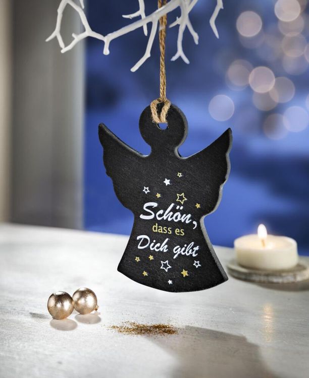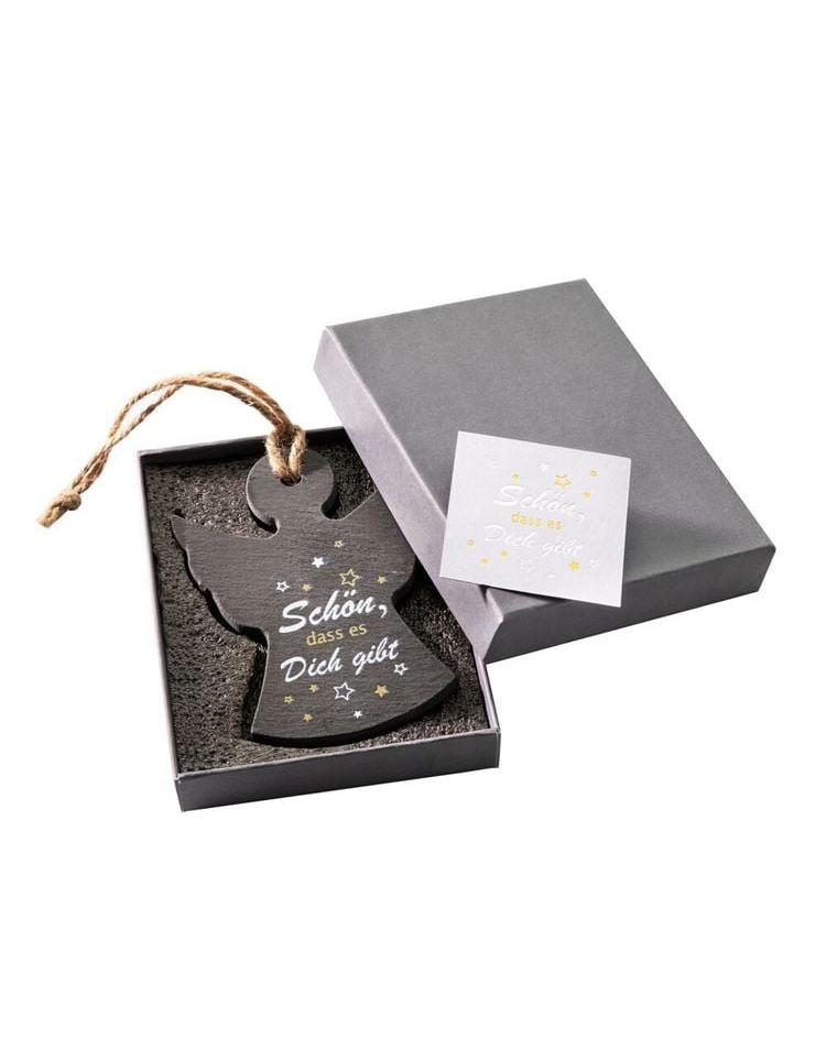 Engel aus echtem Schiefer Höhe 10 cm Beschriftet mit liebevollem Kompliment In stabiler Geschenkschatulle Inkl. edlem Kärtchen, rückseitig Platz zum Beschriften Senden Sie einen himmlischen Boten aus und verschenken Sie ein Kompliment Einfach mal wieder Danke sagen und Schön, dass es dich gibt ? Warum überlassen Sie diese nette Botschaft nicht der Schiefertafel Engel mit Spruch? Die Engelsilhouette ist aus echtem Naturschiefer gefertigt. Umringt von einem Meer aus Sternen ist dort in zweifarbiger Schrift zu lesen Schön, dass es dich gibt . Sollte man das nicht eigentlich viel öfter sagen? Hübsche Botschaft, elegant verpackt Der Himmelsbote kommt in einer schmucken Box und ist damit gleich verschenkfertig verpackt. Gut gepolstert liegt der (Schutz-)Engel in der Schachtel, sodass das Geschenkset auch einer Postversendung standhält. Mit dabei ist ein elegantes Geschenkkärtchen. In silberner und goldener Schrift wird dort die nette Botschaft noch einmal wiederholt. Auf der Rückseite der Karte ist Platz für Ihren Namen und den des Beschenkten und einen kurzen persönlichen Gruß. Dank des praktischen Aufhängers aus Jute kann der Beschenkte den hübschen Deko-Engel sofort dort aufhängen, wo er ihn immer im Blick hat. Unser Tipp: Auch schön als Geldgeschenk, denn in der Box ist auch noch Platz für einen gefalteten Geldschein. Schiefertafel Engel mit Spruch - Engelsilhouette aus Schiefer - Vorderseite mit zweifarbigem Print: Sterne und Spruch Schön, dass es dich gibt - Aufhänger aus Juteband - In anthrazitfarbener Geschenkbox aus festem Karton - Kärtchen mit Folienprägung in Gold und Silber mit Spruch Schön, dass es dich gibt - Maße Engel: 7,5 x 10 cm Bestellen Sie gleich online das himmlische Geschenkset Schiefertafel Engel mit Spruch, und verschenken Sie ein wunderschönes Kompliment! ... und am besten ordern Sie gleich noch ein weiteres Exemplar, dann haben Sie immer ein schönes Präsent zur Hand!