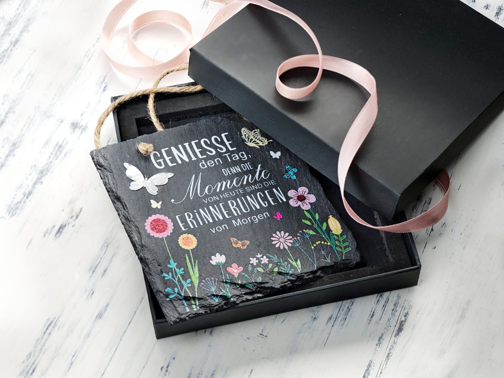 So haben Sie und Ihre Lieben immer vor Augen, wie wichtig es ist, den Augenblick zu genießen. Als Belohnung gibt&lsquos bleibende, schöne Erinnerungen. Jede Schiefertafel "Genieße den Tag" ist ein Unikat, aus Naturschiefer mit gebrochenen Kanten, Spruch im Handlettering-Stil, Tafel mit bunten Blumen und einem silbernen 3D-Metall-Schmetterling verziert. Mit Juteband zum Aufhängen. Maße 12 x 2,5 x 12 cm.