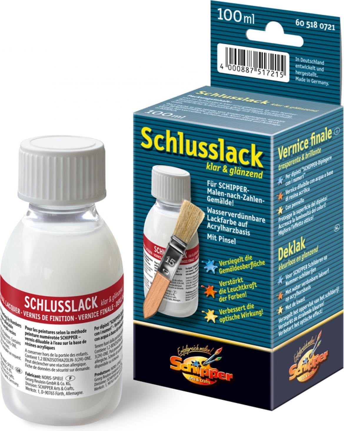Am Ende steht der grosse Moment, wenn das Bild fertig ist und der Maler voll Stolz sagen kann: Das habe ich gemacht.. Das fertige Bild schmückt nun die Wohnung, der Hobbymaler ist stolz auf die eigene Leistung und erntet Anerkennung von Familie und Freunden. Eine solche Arbeit sollte für eine lange Zeit erhalten bleiben. Der Schlusslack klar & glänzend von SCHIPPER Arts & Crafts ist eine wasserverdünnbare Lackfarbe auf Acrylharzbasis. Er versiegelt die Oberfläche des Gemäldes, verstärkt die Leuchtkraft der Farben und verbessert die optische Gesamtwirkung. 100-ml-Fläschchen, ausführliche Anleitung und breiter Pinsel für gleichmässigen Auftrag.