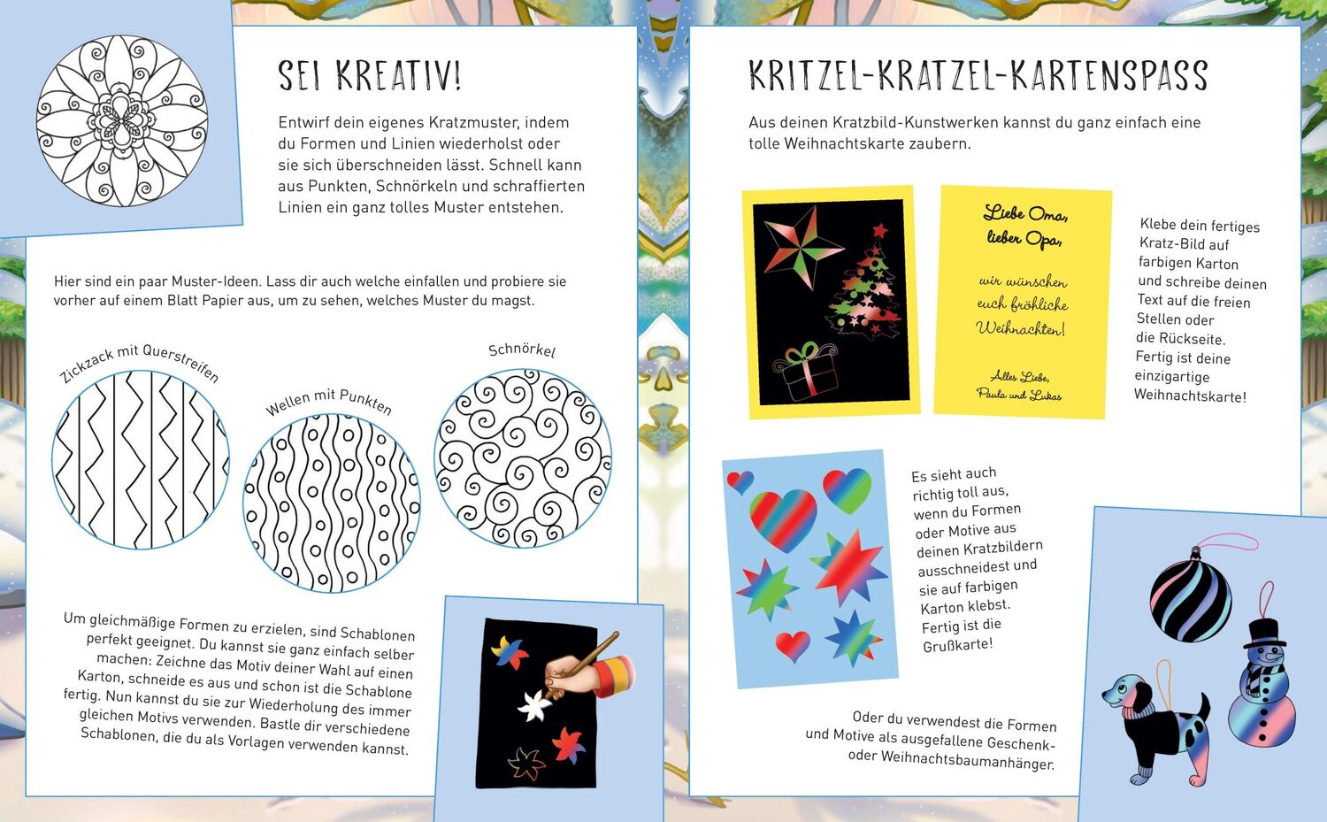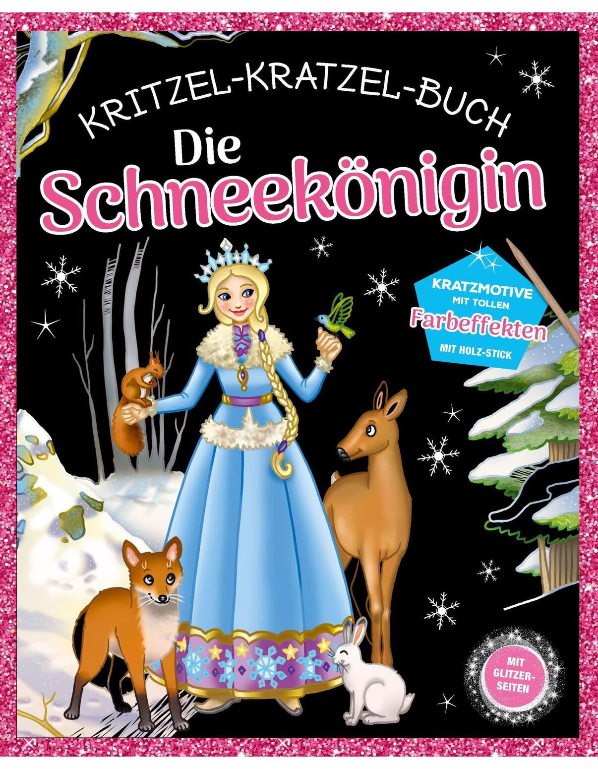Als Kratzkünstler verwandelst du die schwarzen Seiten in farbenfrohe Bilderwelten. Mit dem beiliegenden Holz-Stick entfernst du dafür einfach Stück für Stück die schwarze Schicht. Die bunten Umrisslinien leiten dich dabei. Darunter kommen eine aufregende Schlittenfahrt, ein rauschender Ball, ein lustiger Schneemann und viele weitere wunderschöne Bilder mit der Schneekönigin und ihren Freundinnen zum Vorschein.